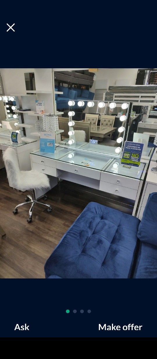 New Vanity White 5 Drawers Diamond Knobs Tempered Glass Hollywood Mirror LED Light Adjustable Light $619+ Tax