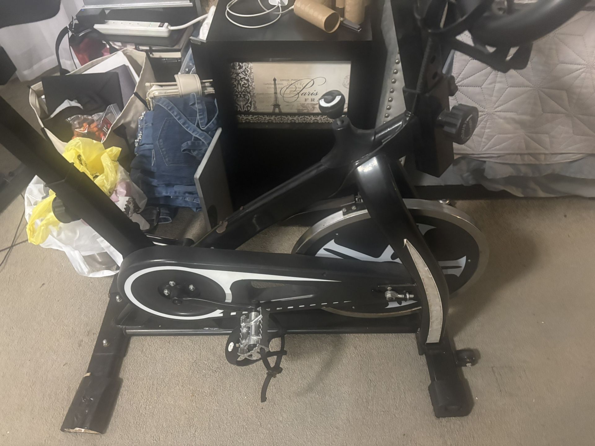 V fire stationary cycling bike. Good working condition, digital readout works, battery operated, some minor cosmetic damage (left rubber grip, rear floor pads in pics) bike works great, just wear from usage. Switched to recumbent bike. $50 OBO. Thanks