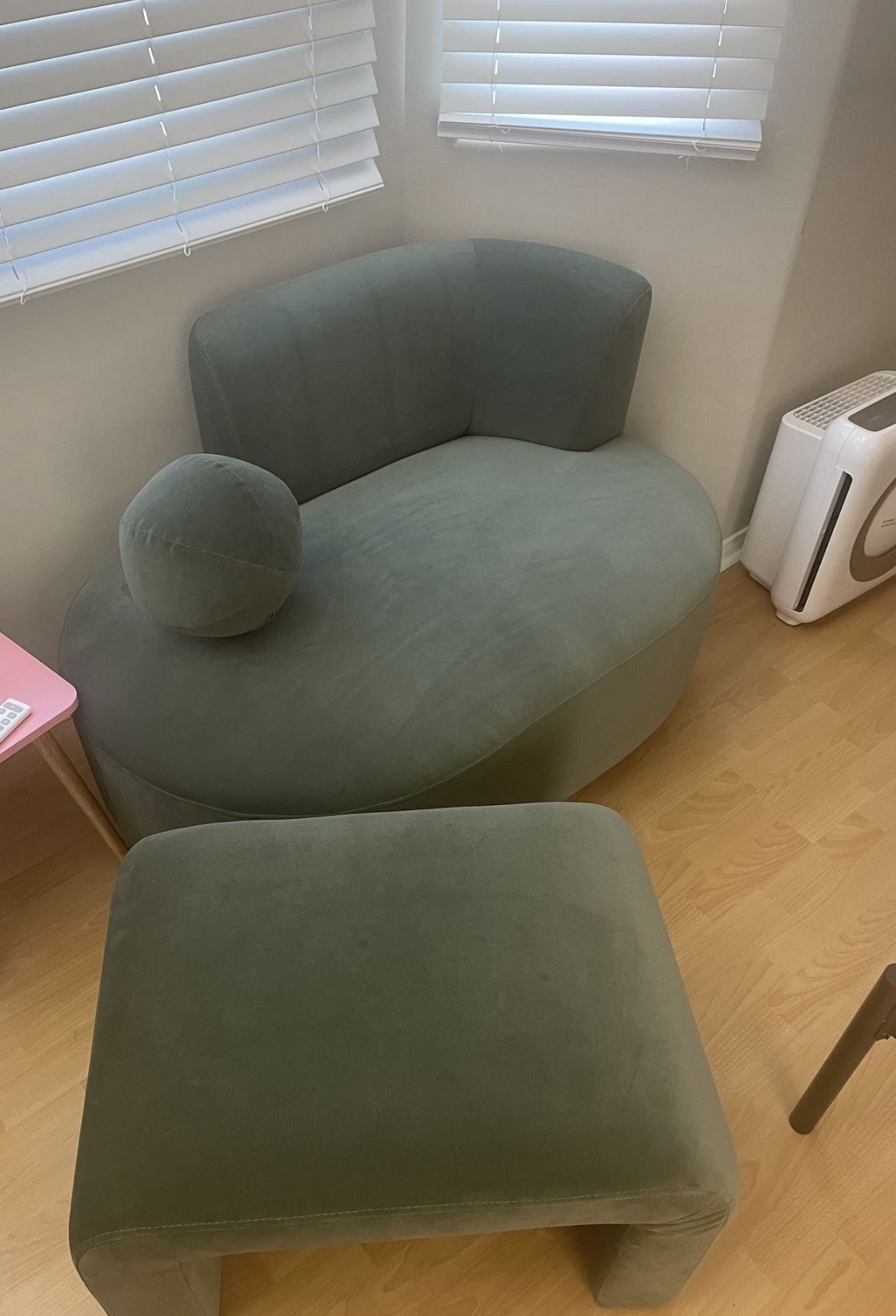 -Like new, less than a year old -Ball pillow included -Can come w/added foot stool for $250 total, or with matching swivel chair for $350 total -Velvet fabric -Wood frame -Dimensions in photo 2 -92109 pick up only, cash only -Non smoker, non pet household