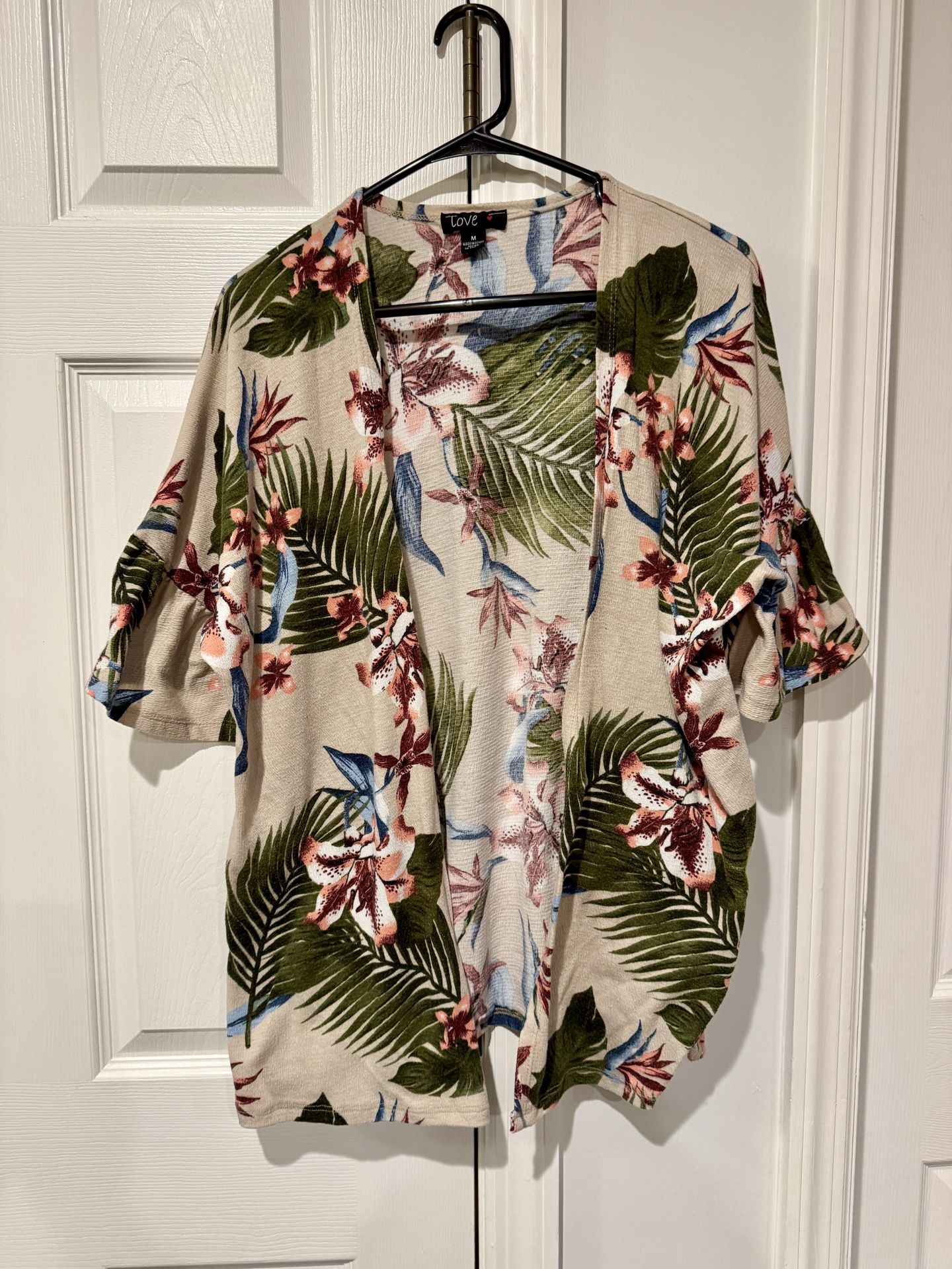 Fun tropical print cardigan with ruffle sleeves in medium but fits up to large. Cute split at sides. Use as coverup too.