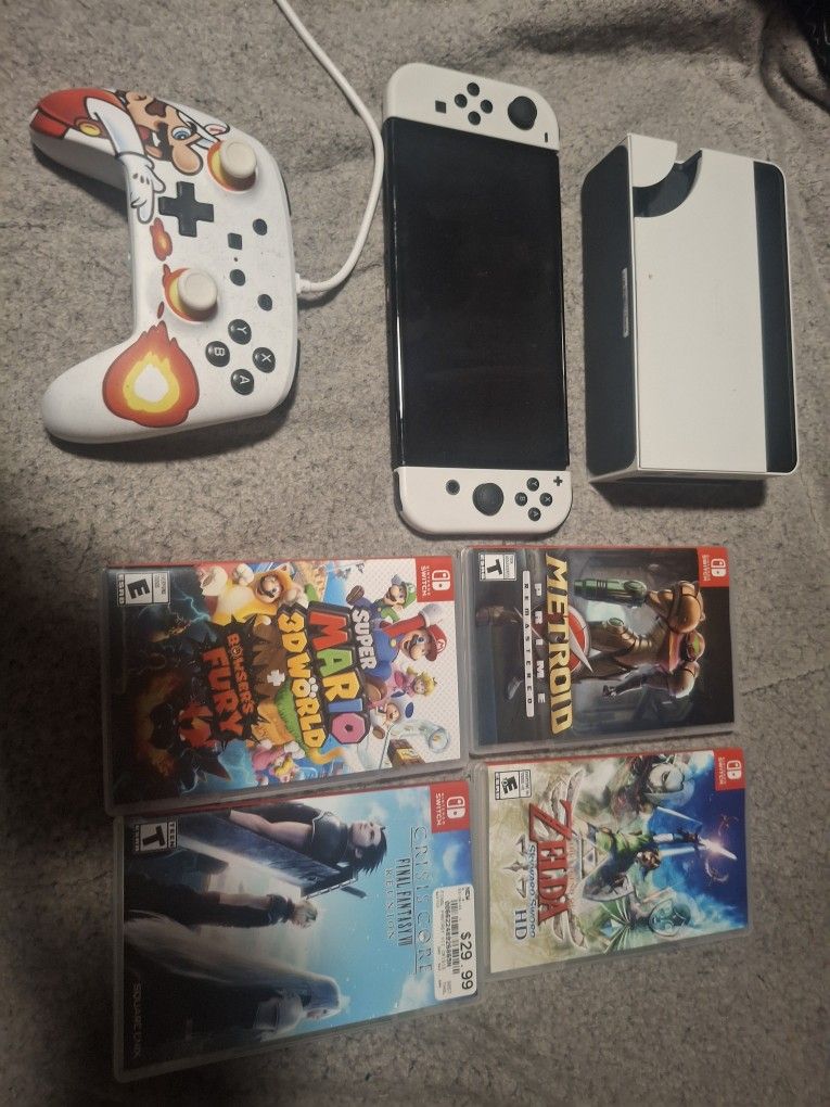 Slightly used Nintendo Switch with everything it came with and 4 games it didn't. Over 15 games bought and downloaded on system. Can leave on there for extra $$$. The games with cases include; Metroid Prime Remastered, Mario 3D World, FF7 Crisis Core, and Zelda Skyward Sword. $200 for all of it (downloaded games included) valued at over $700. $170 for factory reset device with the 4 external games included. Also includes zip up carrying case.