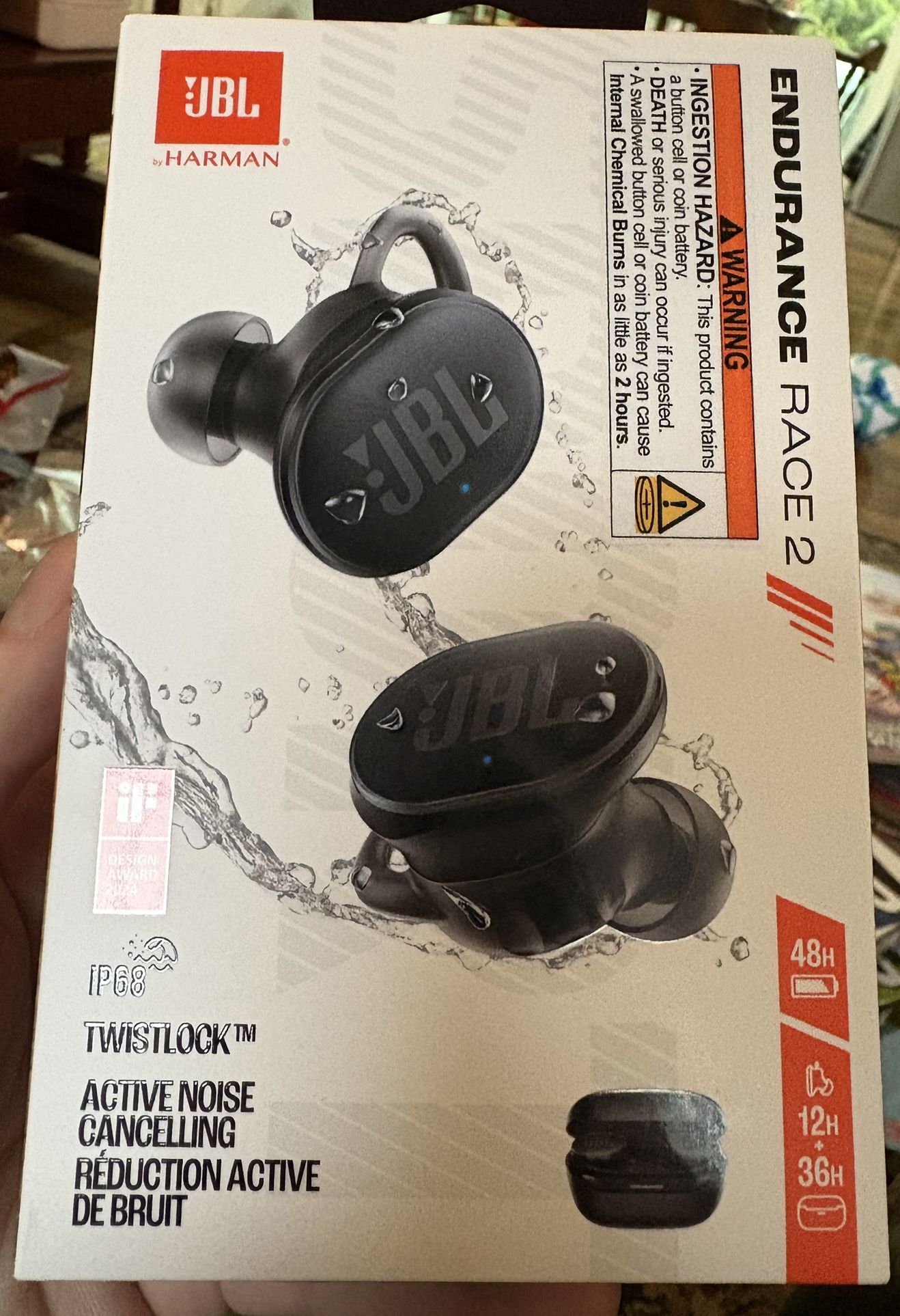Brand new ear buds! I received rhese wireless earbuds for Christmas, I can’t return them, and I won’t wear in ear headphones. I haven’t opened the box. JBL is a great audio brand. These are noise canceling, waterproof, and have a microphone in them. Message me ✌️ -TJ Product info: Brand: JBL Model Name: JBL Endurance Race 2 Color: Black Ear Placement: In Ear Form Factor: True Wireless Impedance: 16 Ohms JBL Pure Bass sound: JBL Endurance Race 2 earbuds feature 6.8mm dynamic drivers that deliver powerful JBL Pure Bass sound. 48Hrs of playback time, plus speed charging: Enjoy 12Hrs of playtime, plus another three full charges (36Hrs) in the charging case.* 10 minutes on a USB type-C charging cable will give you another four hours of playtime. (*with ANC off) 4 mics for crisp, clear calls: Two beamforming mics on each earbud pick up and transmit your voice while canceling out ambient noise. So you can make clear, crisp calls even when you're jogging through a busy park on a breezy day. Active Noise Cancelling listens to your surroundings & filter out distracting noise. Smart Ambient lets you control how much of the outside world you want to hear, so you can talk with others or stay aware of your surroundings and keep your earbuds in. Enhance your work-out with 'Sports Mode': Use the JBL Headphones app to match your workout with ANC, Ambient Aware and EQ. Choose one of the six default Sports Modes - or you can customize your own.