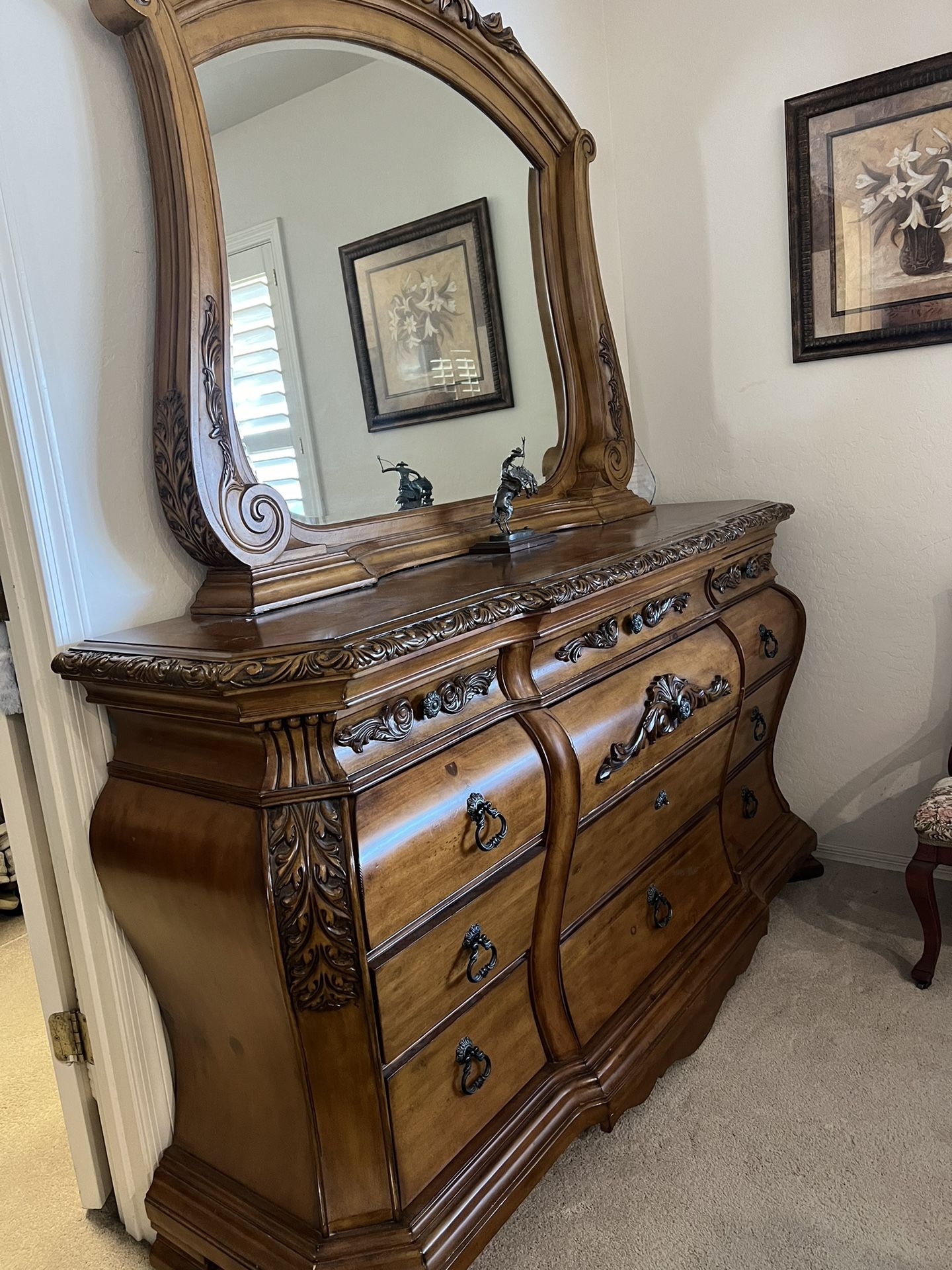 Cali king bed frame One armoire- BEAUTIFUL two night stands One long dresser with gorgeous mirror Must pick up with 2 people to help lift. We are not able to help move at this time.