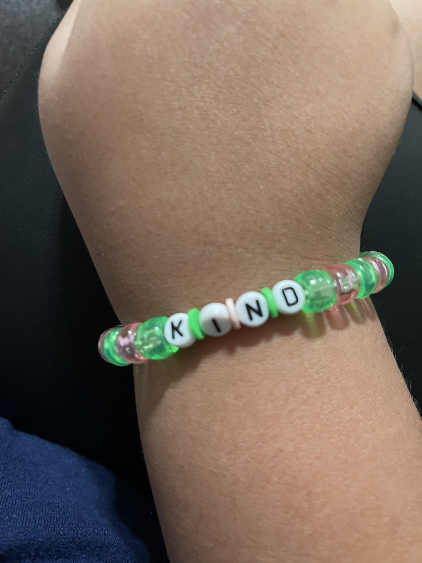 Homemade pink and green bracelet that says kind