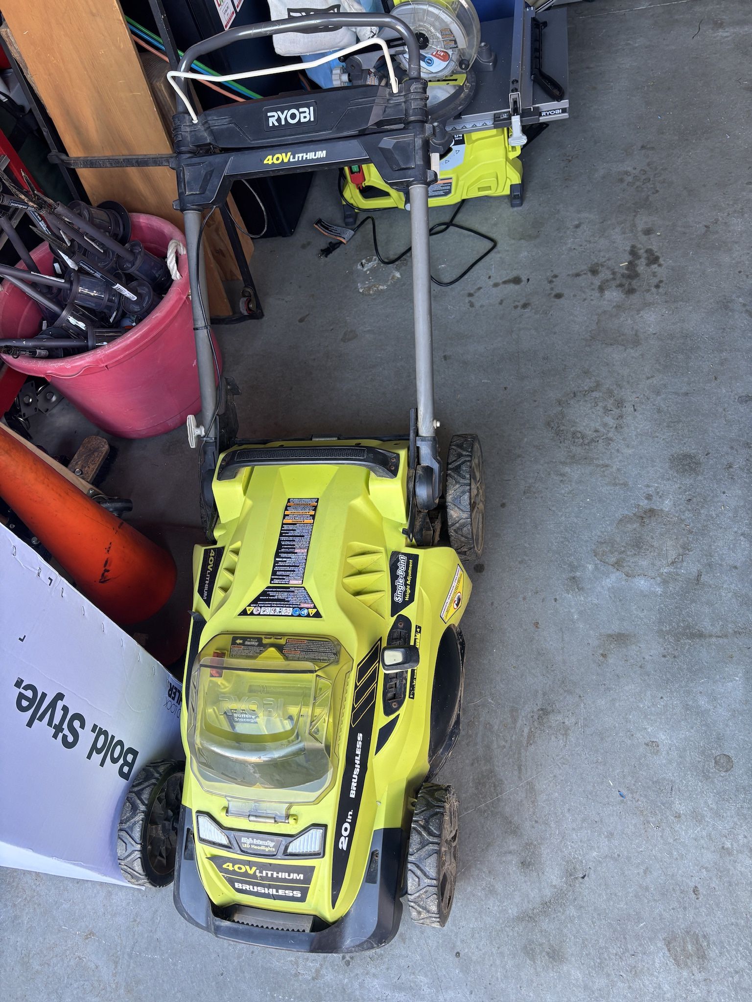 Nice 40v Ryobi mower. Works great. No bag. Self drives and has power saving modes. Tool only. Have a battery I can sell for $30 if interested.