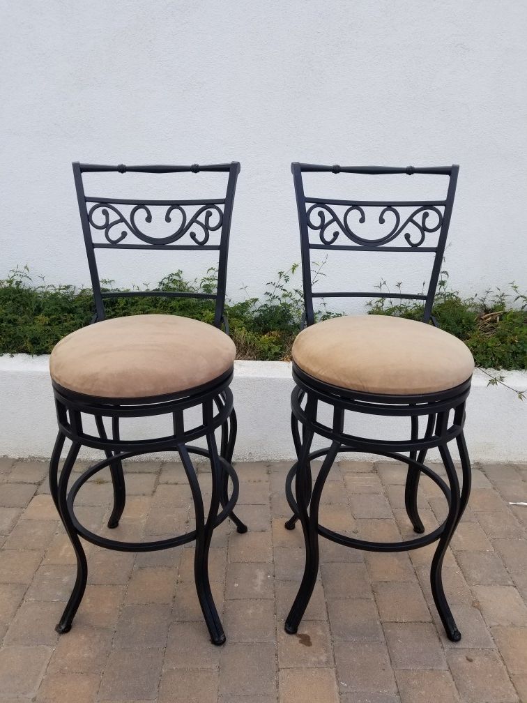 These Are 2 Black Heavy & Solid Wrought Iron Barstool Chairs With Tan Faux Suede Material. The Seats Swivel.