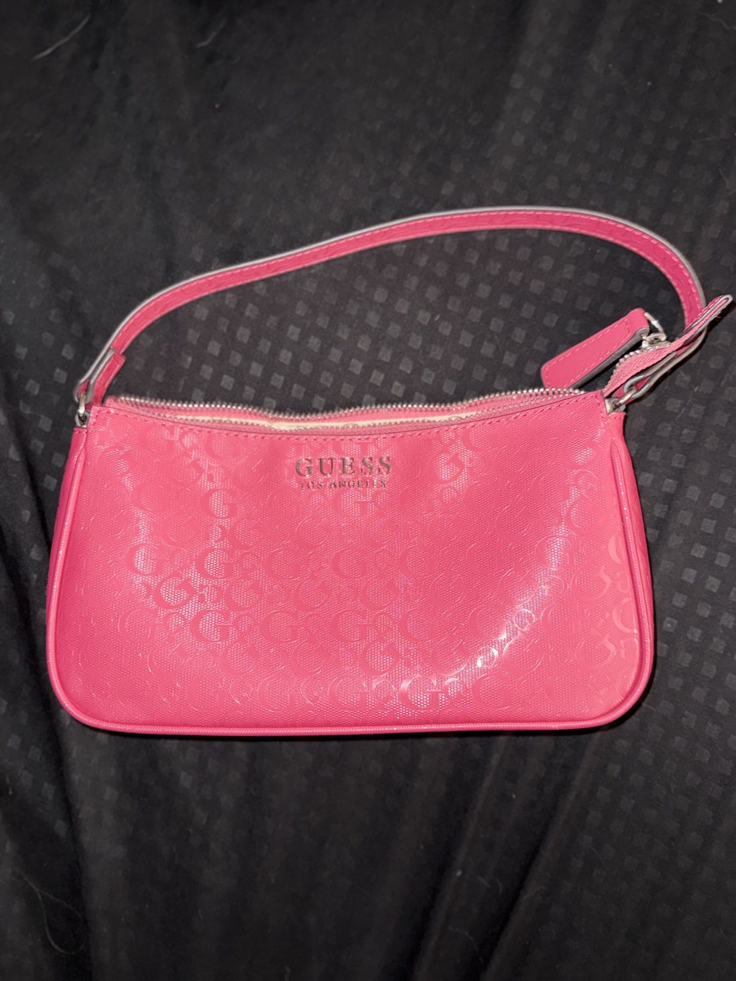 Perfect for Valentine’s Day !! In great condition! Brand: Guess Style: Shoulder Bag / Baguette Bag Color: Pink / Fuchsia Material: Faux leather with logo-printed lining Hardware: Silver-tone hardware Features: Top zip closure, single shoulder strap, pulse extra strap and interior pockets