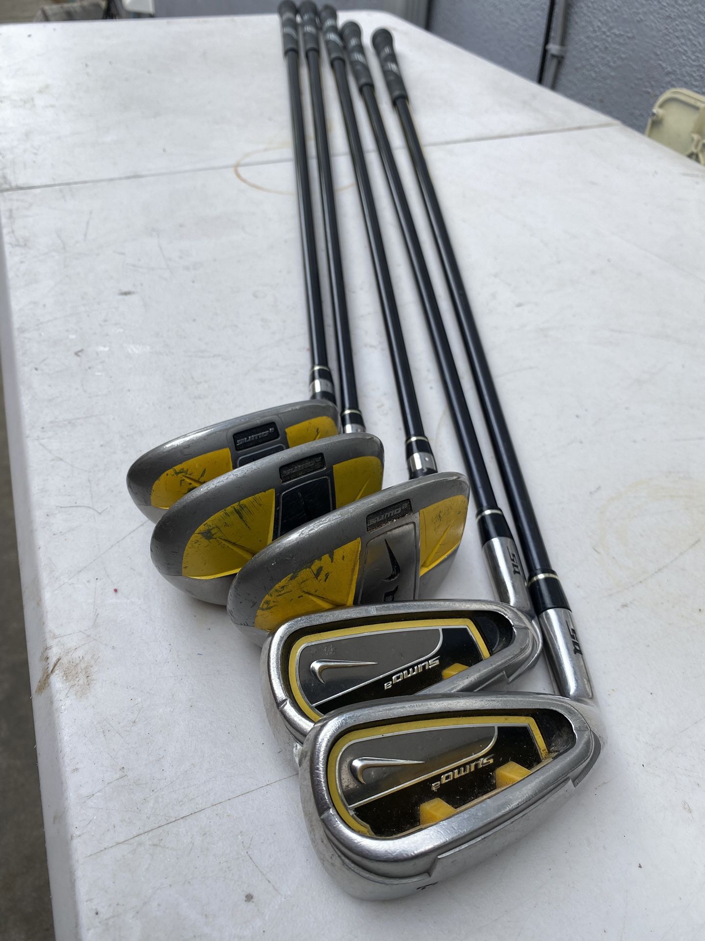 *CLUBS ARE IN FAIR CONDITION* *CHECK PHOTOS* *5 USED NIKE GOLF CLUBS* -3(20) -4(23) -6(30) -9 iron -P wedge This lot of 5 vintage Nike SQ Sumo 2 Lefty golf clubs includes a mixed set of 3, 4, 6, 9, and P irons, all featuring a regular flex Diamana graphite shaft. These high-launching clubs are designed for left-handed male golfers and come with a standard lie angle. The Sasquatch Sumo 2 model offers a combination of graphite and steel materials, making them a versatile and powerful addition to any golfer's equipment.