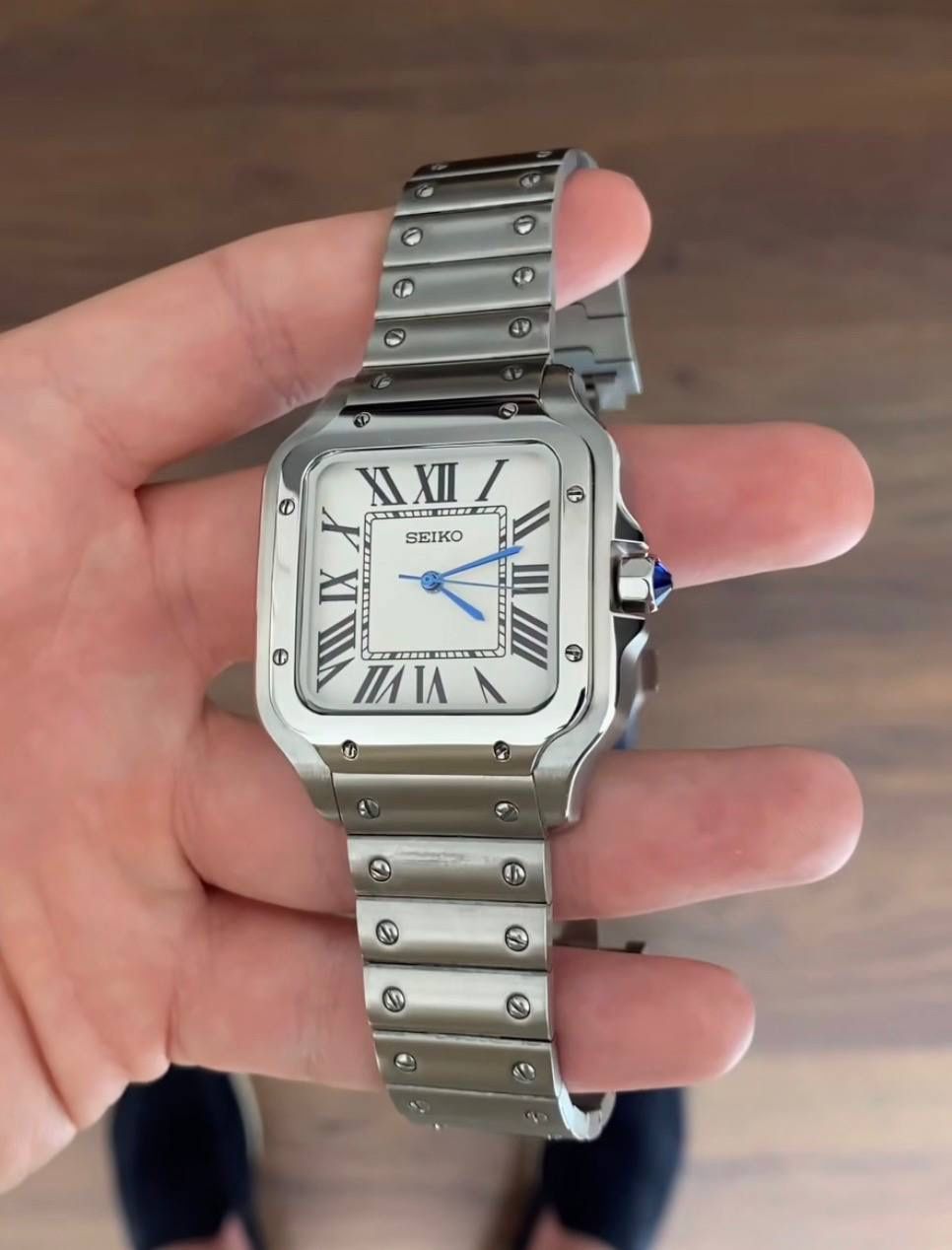 Understated, iconic, and timeless — the Seiko Mod: Santos White pairs a crisp white dial with classic Roman numerals and deep blue hands for a look that’s both refined and versatile. Inspired by the original luxury design, this 39mm timepiece runs on the reliable NH35 automatic movement and is hand-assembled for everyday sophistication. ⏳ Premium Features: ✔ Diameter: 39mm (excluding crown) ✔ Movement: Seiko NH35 automatic movement ✔ Thickness: 11.5mm ✔ Glass: Sapphire crystal with anti-reflective coating ✔ Dial: Matte white with Roman numerals and heat-blued hands ✔ Luminous: Subtle Luminova on hands ✔ Case: 316L stainless steel with brushed and polished finish ✔ Crown: Screw-down with cabochon-style accent ✔ Bezel: Santos-style square bezel with exposed screws ✔ Wrist Size: Adjustable from 14.5cm to 22cm ✔ Lugs: 20mm ✔ Bracelet: Integrated 316L stainless steel with butterfly clasp ✔ Case Back: Available in transparent or closed steel ✔ Water Resistance: 3 ATM ✔ Functionality: Time and date A clean, classic build for those who value timeless design with modern reliability. DM to make it yours. 🤍⌚