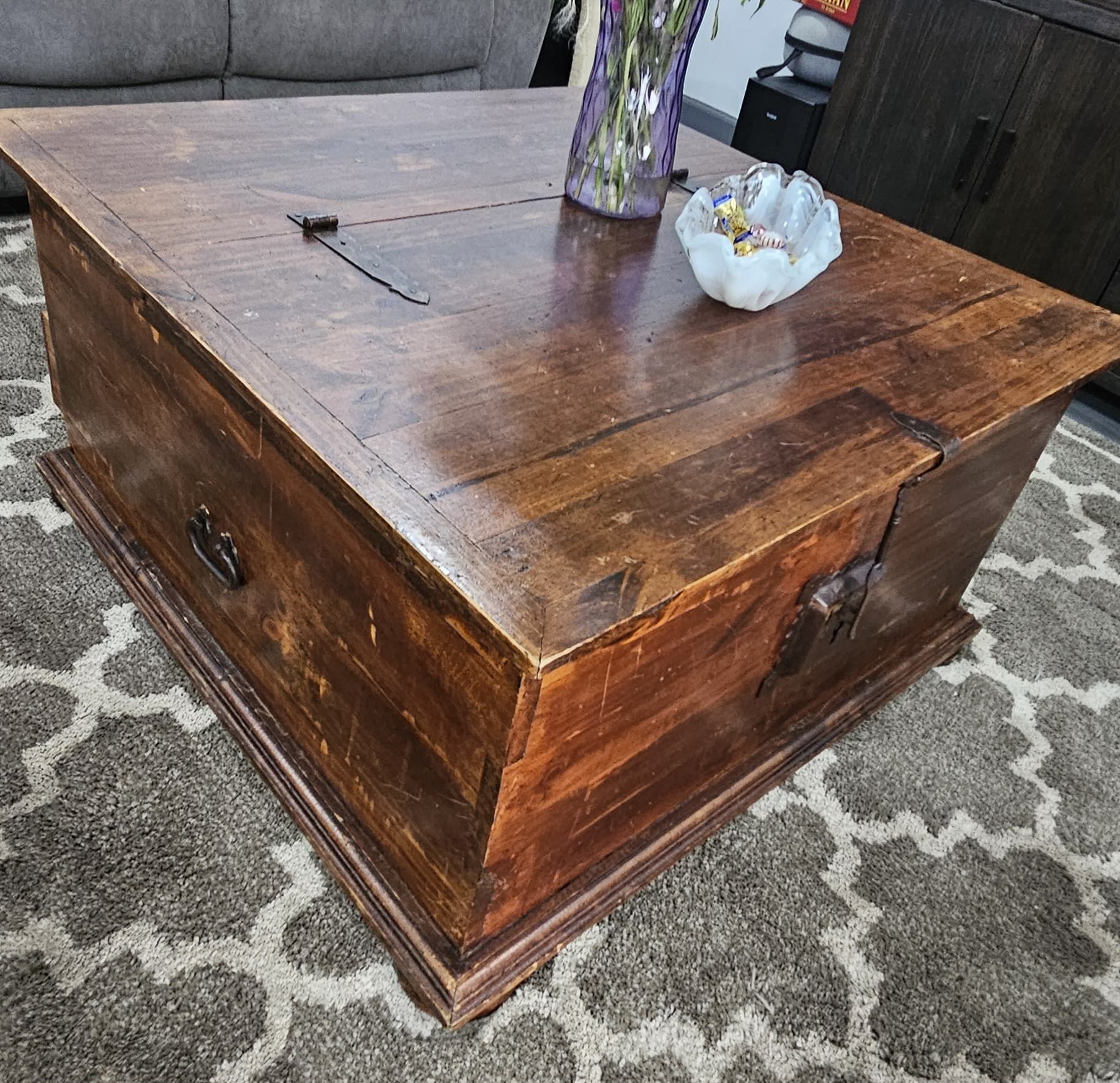 Rustic Trunk-Style Coffee Table – Storage & Style Beautiful trunk-style coffee table with a top opening door and 5 drawers, perfect for adding charm and extra storage to your living room. ✔ Solid and sturdy ✔ Large storage space inside ✔ 5 drawers for organizing small items ✔ Unique rustic look that fits many home styles Great for blankets, books, remotes, or decor. Good condition. Ready to use. Message me if interested! Mesa de Centro Estilo Baúl – Con Almacenamiento Hermosa mesa de centro estilo baúl con tapa que se abre y 5 cajones, perfecta para darle estilo y espacio de almacenamiento a tu sala. ✔ Fuerte y resistente ✔ Gran espacio interior para guardar cosas ✔ 5 cajones para organizar objetos pequeños ✔ Estilo rústico único que combina con muchos ambientes Ideal para mantas, libros, controles o decoración. En buen estado. Lista para usar.