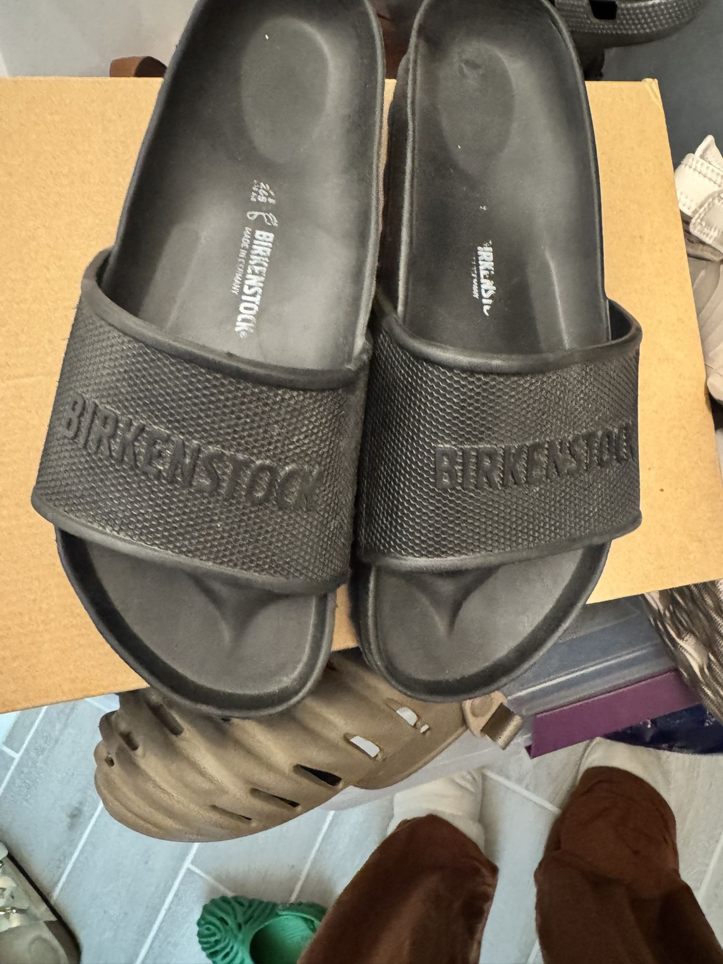 Black Birkenstock sandals. Men size 10, women size 8.