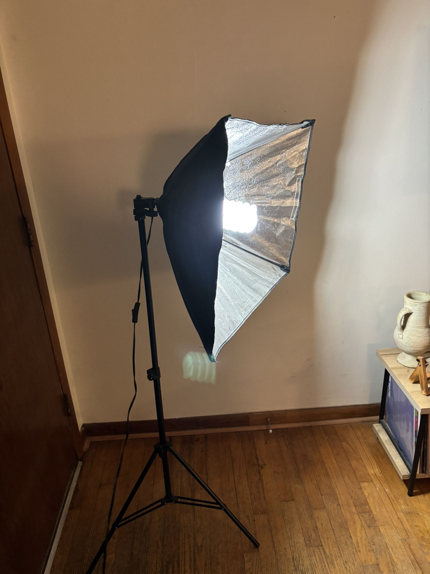Foldable/ mobile studio light- great for photography, video, content creation etc. packs up small- can fit in backpack. Extendable rods to make it various heights.