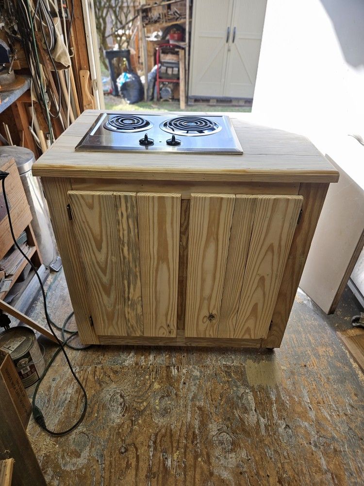 Electric patio cooktop. Wood cabinet with cooktop. Ready to be stained, painted or just polyed