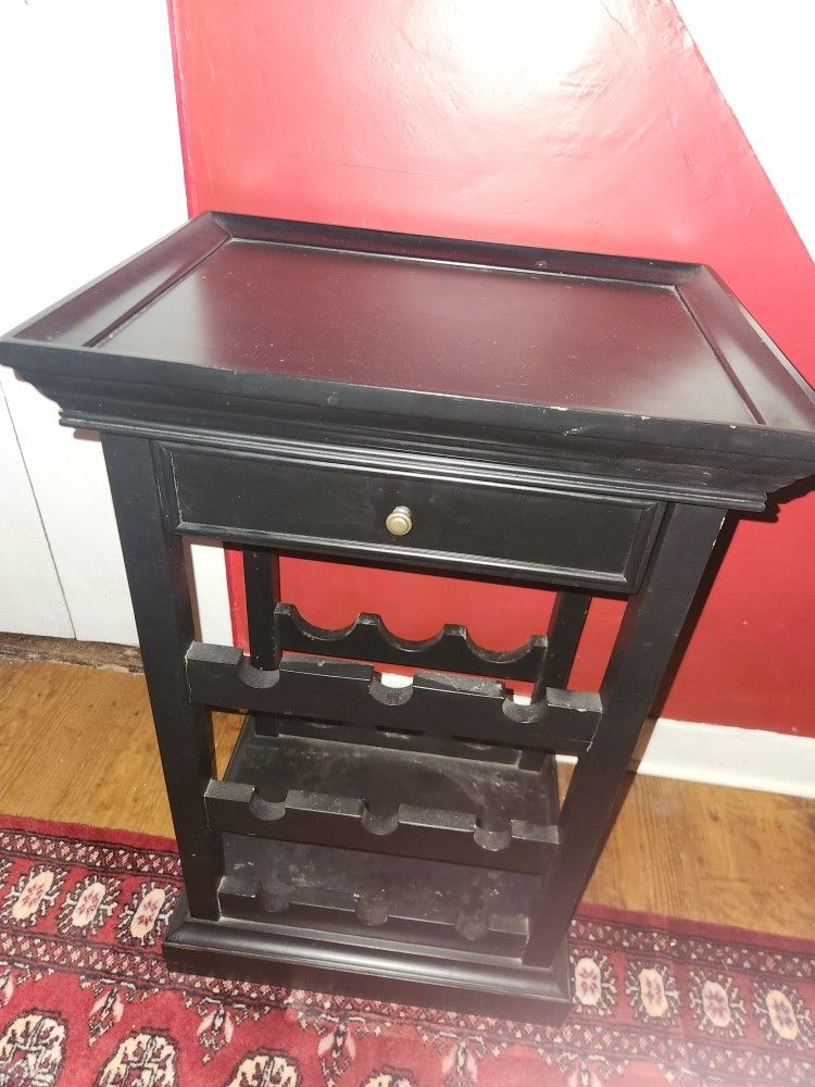 The Vintage Rustic Wood Wine Rack is a charming addition to any kitchen or dining area. With a lift top serving tray and the capacity to hold up to 9 bottles of wine, this black wooden cabinet is both functional and stylish. The unique design features a vintage rustic look, adding character and warmth to your home decor. At 28 inches in height, 11 1/2 inches in depth, and 16 inches in width, this wine rack cabinet is the perfect size for showcasing and storing your favorite bottles of wine. Top tray measures 18 1/2 in x 14 in.