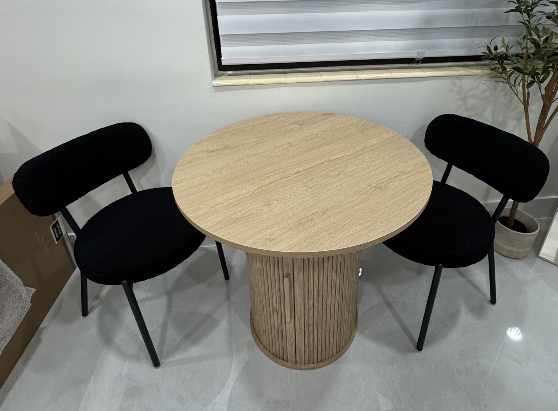 Beautiful modern 3-piece dining set featuring a 31” round table with hidden storage and 2 upholstered chairs. Like new condition.