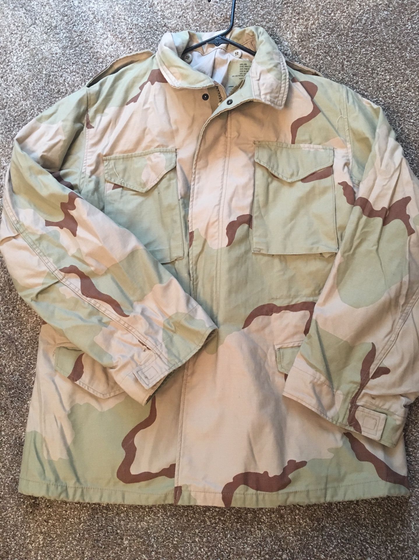 Heavy duty cold-weather Desert camouflage coat size large. Great quality you won’t be disappointed. I also have other camouflage items available