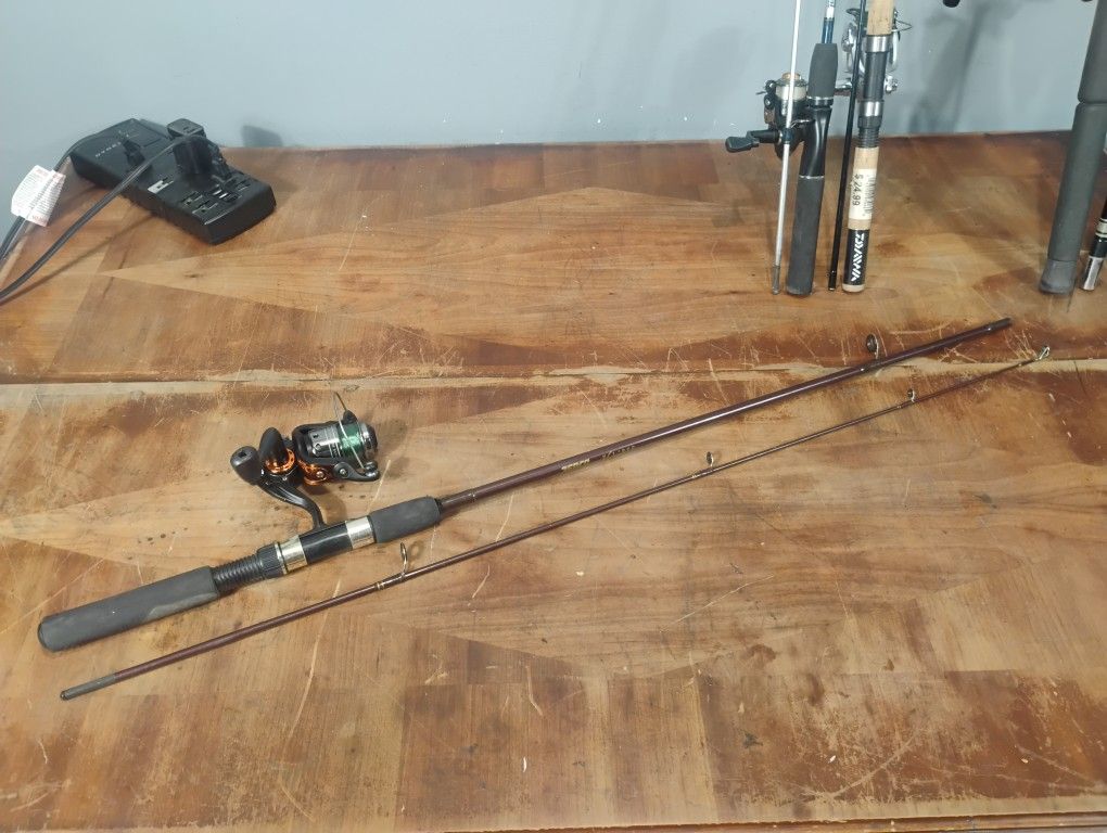 Spinning teel with new 8lb line that works great. 6' Zebco medium action rod.
