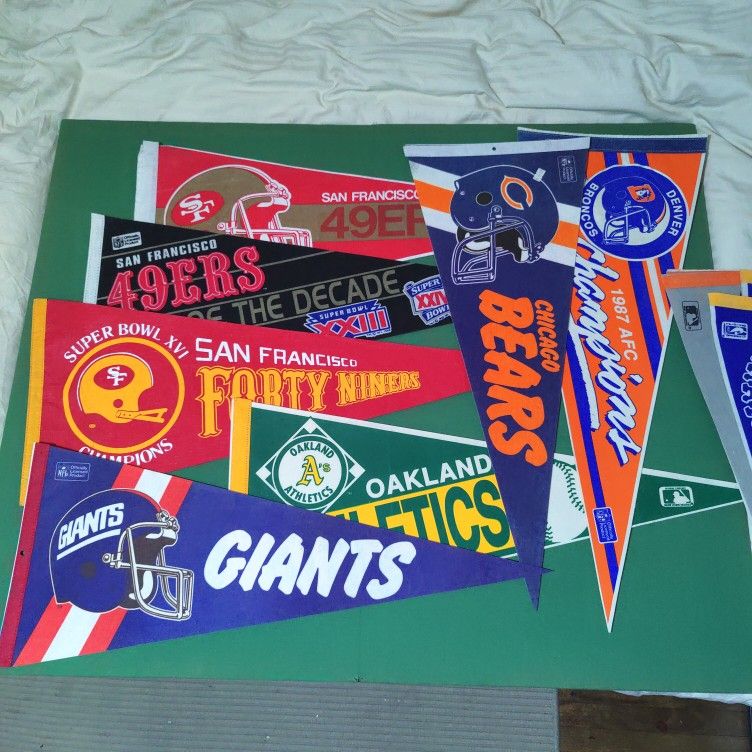 Mostly late 1980s NFL felt pennants but a few others mixed in, I may make another listing for some of the others. Happy to make a deal if you want a bunch, and shipping is okay too if you don't want to drive to pick up. NFL Chicago Bears 1980s blue orange - $8NFL Denver Broncos Super Bowl XXII 1987 AFC Champions - $8 NFL NY Giants 1980s blue - $14 NFL Oakland Athletics As 1980s - $15 NFL San Francisco 49ers Farewell Season NHL San Jose Sharks hockey 1990s - $25Cal Berkeley Bears College Football Pennant - $7MLB SF Giants ballpark $10MLB SF Giants gray background $10MLB SF Giants world series 2012 - $6 NBA Golden State Warriors GSW signed by Coach Don Nelson - $40 and $30 [I have 2, more pics will be in a separate posting] SOLD NFL San Francisco 49ers Farewell Season Candlestick Park Final Game 1(contact info removed) - $20 SOLD NFL SF 49ers 1980s red gold logo design - $15 SOLD NFL SF 49ers 1982 Super Bowl XVI Champions red orange - $20 SOLD NFL SF 49ers Team of the Decade Super Bowl Champions 1980s - $15 for fans of major league baseball, national football league, NBA national basketball association, hockey league, vintage 80s 90s sports promo memorabilia