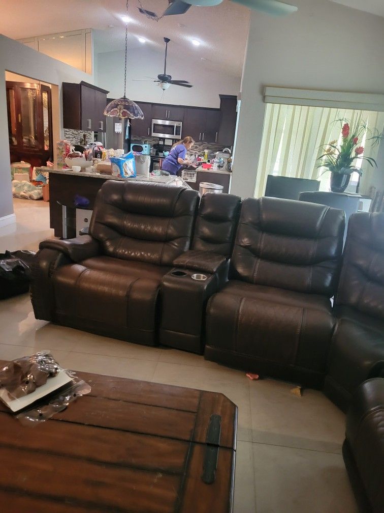 5 leather seat couches 2 electrical recliners and one manual recliner. 0erational. Has scrath damage from cat. Pick up only !