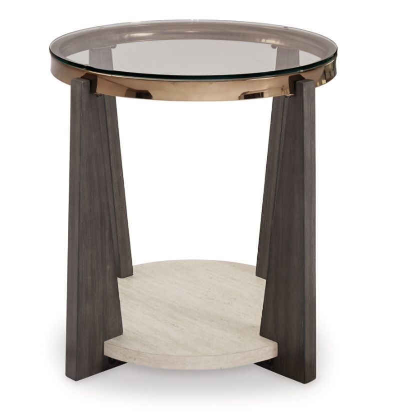 (2) Frazwa End Table Brand new Description A modern twist on mixed-media design, the Frazwa end table is totally brilliant. Solid wood legs and a faux travertine shelf merge splendidly with the metal frame for a fresh, contemporary aesthetic. Talk about the perfect spot for cocktails and morning coffee to land. Made with solid wood, faux travertine laminate with MDF substrate and metal Legs with grayish brown wood-tone finish Metal frame with goldtone finish Fixed lower shelf Clear tempered glass tabletop Selling for $ 150 for both , original price is $400 for both.