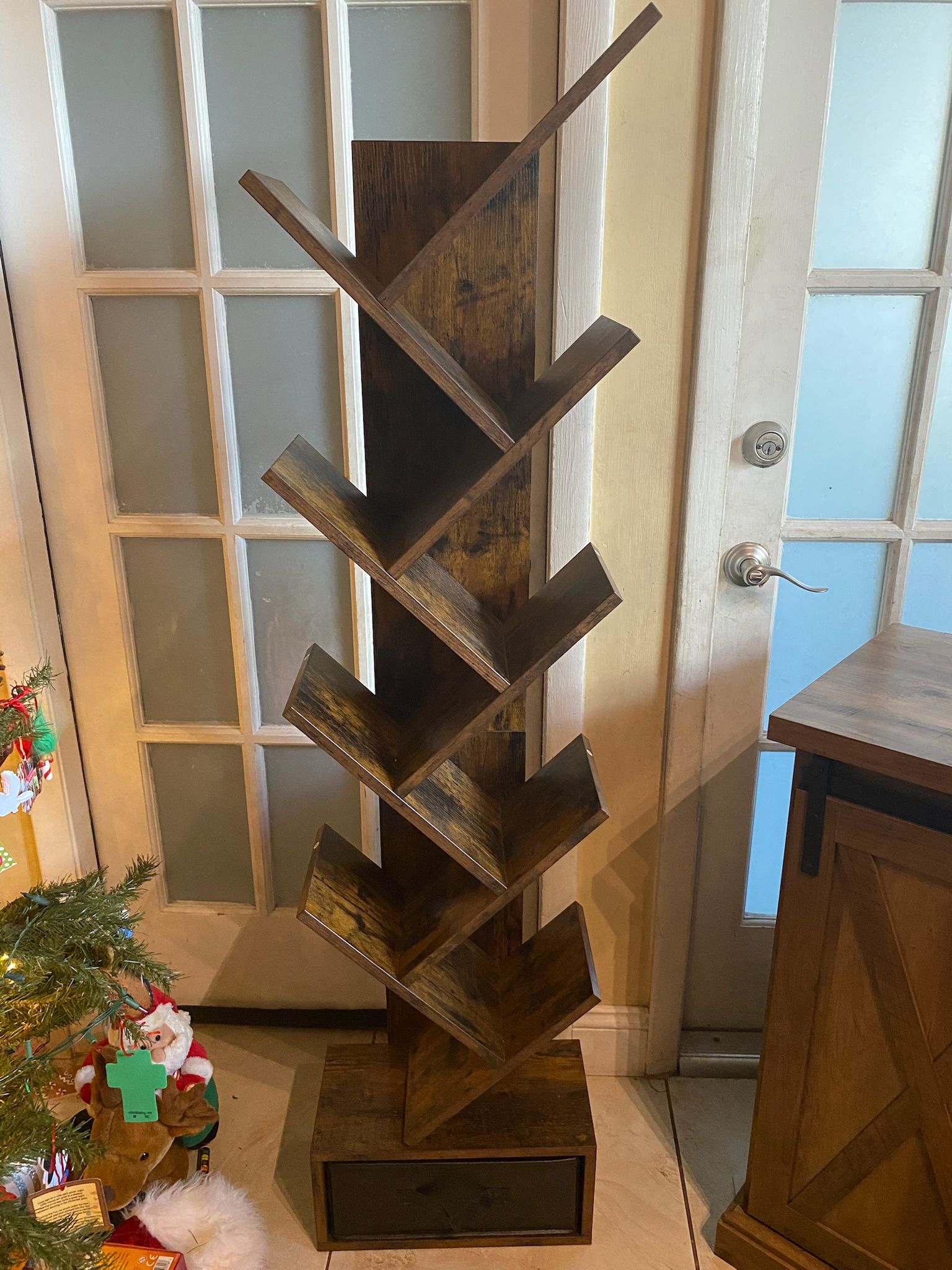 H 58 1/4 W 15 D 7 1/2 Stylish free standing tree-style bookshelf with angled shelves and a lower storage base. Beautiful dark wood finish that works well with modern, rustic or industrial decor. Great as a statement piece for books, plants or decorative items. Unique vertical βtreeβ design Sturdy base with lower storage compartment VIDEO AVAILABLE SO YOU CAN SEE IT LIVE AND VERIFY THE CONDITION LOCAL DELIVERY AVAILABLE FOR AN ADDITIONAL FEE SEE MY OTHER ITEMS π