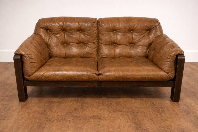 Swanky low profile loveseat with a real wood frame in good condition. Extremely comfortable and easy to sink into. One support band under the left-facing cushion is missing, causing a slight sag that is barely noticeable and easy to fix. Comes from a smoke-free home. Measures approximately 56” wide, 34.5” deep, and 29” high.