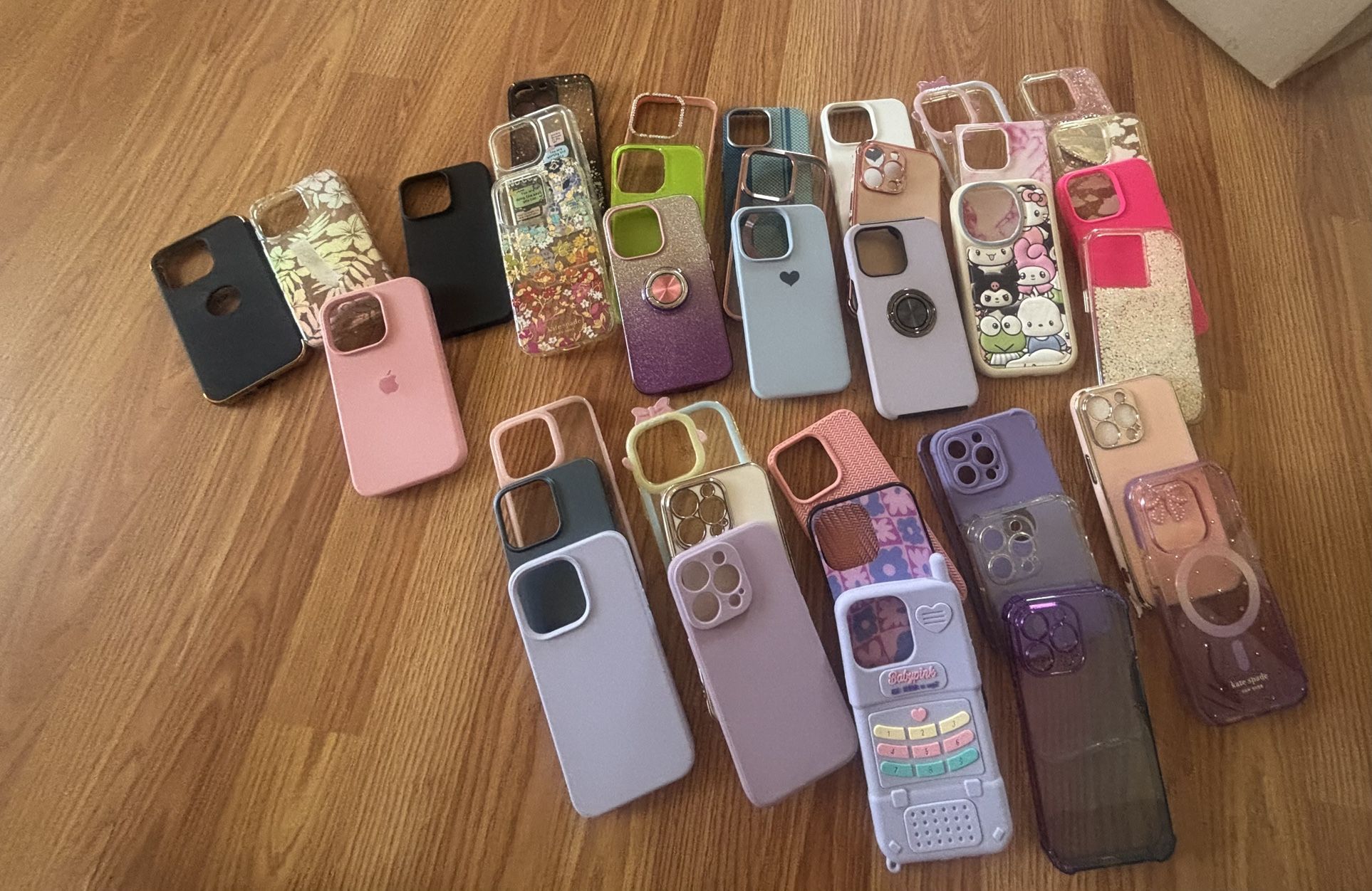 The pink silicone case with the Apple logo is $15 The Loopy case right handed is $30 The purple with mag safe Kate Spade is $20 The glittery case on the right side Casemate is $15 The Kate Spade with colorful flowers is $15