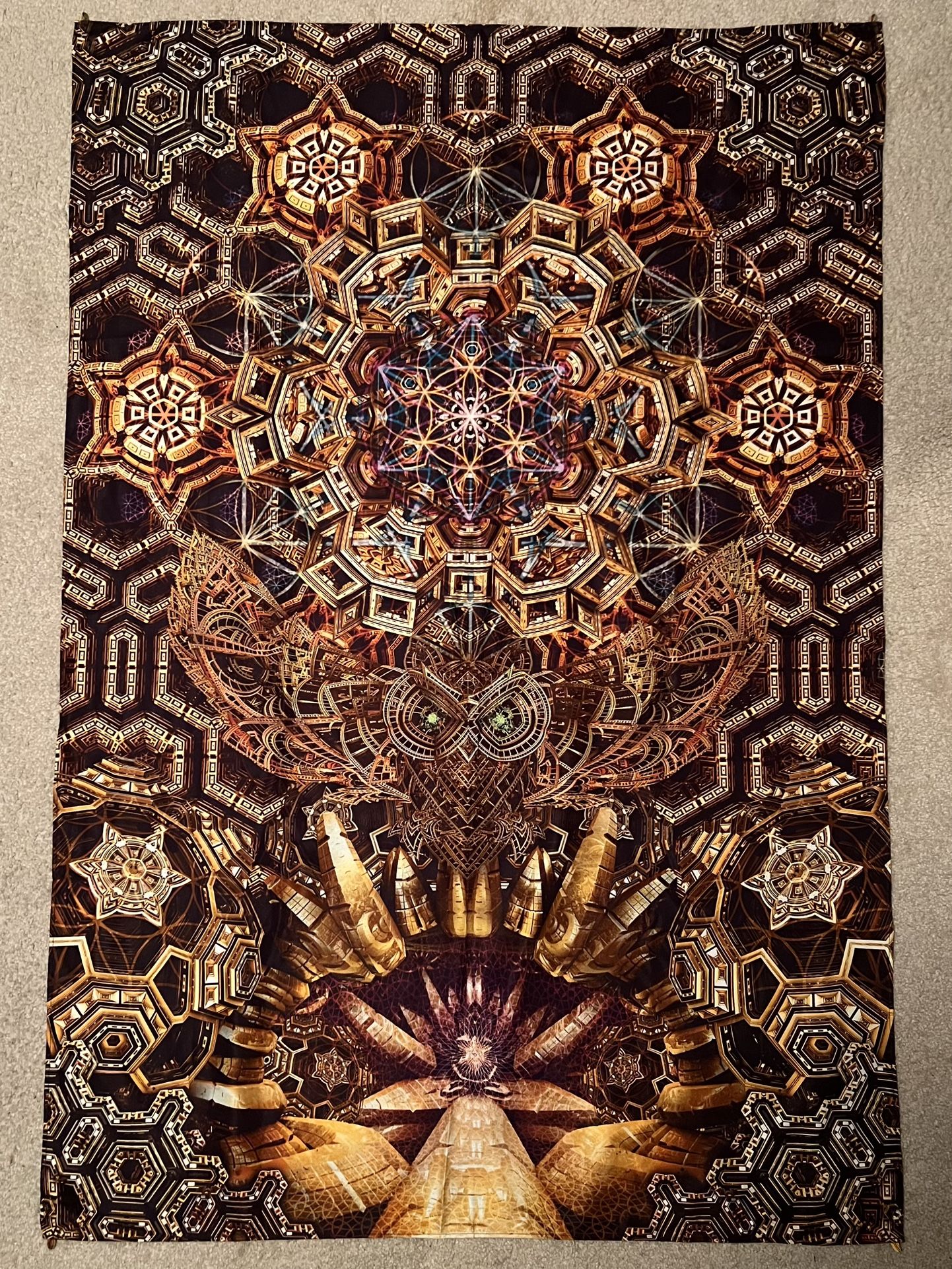 Made by Third Eye Tapestries, this psychedelic mandala-like wall or furniture decoration features an owl with glowing eyes embedded in intricate and colorful patterns 100% polyester, machine wash and dryer safe Length 58 inches Width 39 inches
