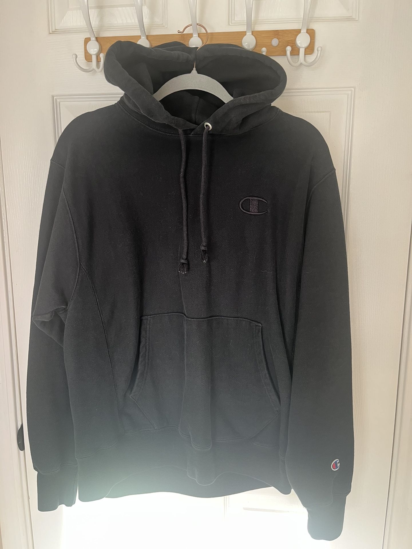 Champion Classic Black Hoodie Cozy and versatile Champion hoodie. Features large iconic logo. Ideal for everyday wear. Size: Men's Medium