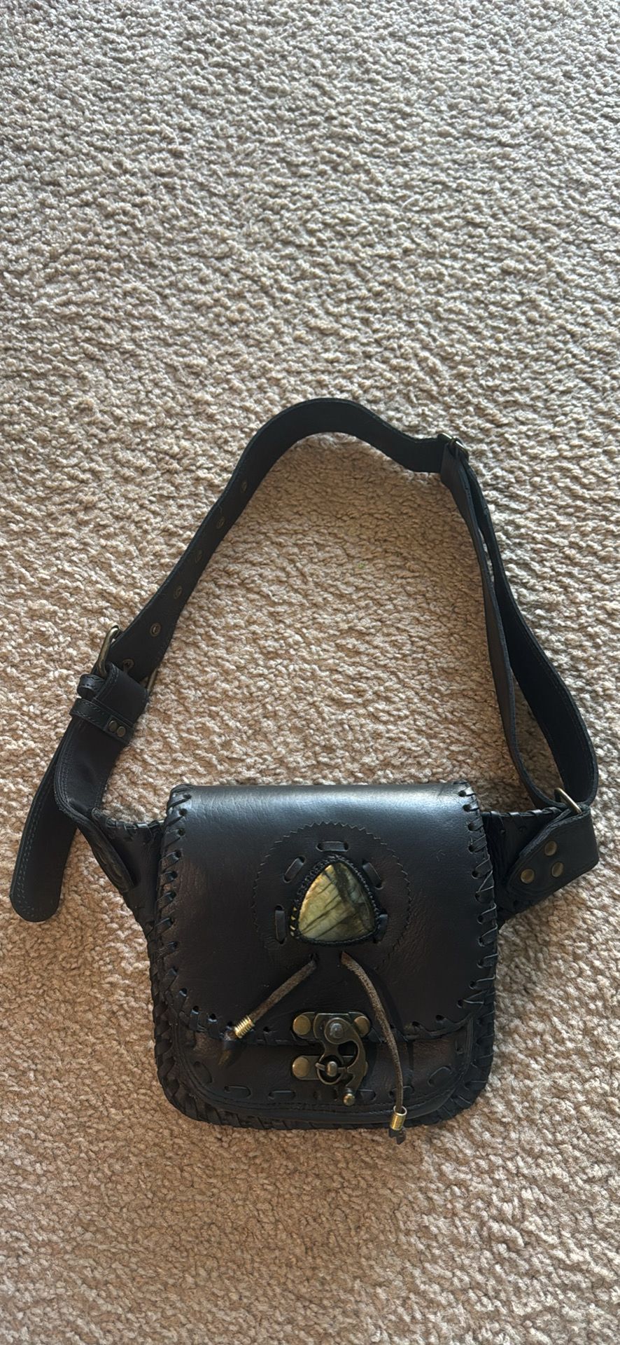 Unique black leather fanny pack. Has cool Laboradite stone accent on front flap and a brass clasp. Adjustable strap for comfy fit. Zippered pocket on back for extra storage. Perfect for festivals or just everyday errands.
