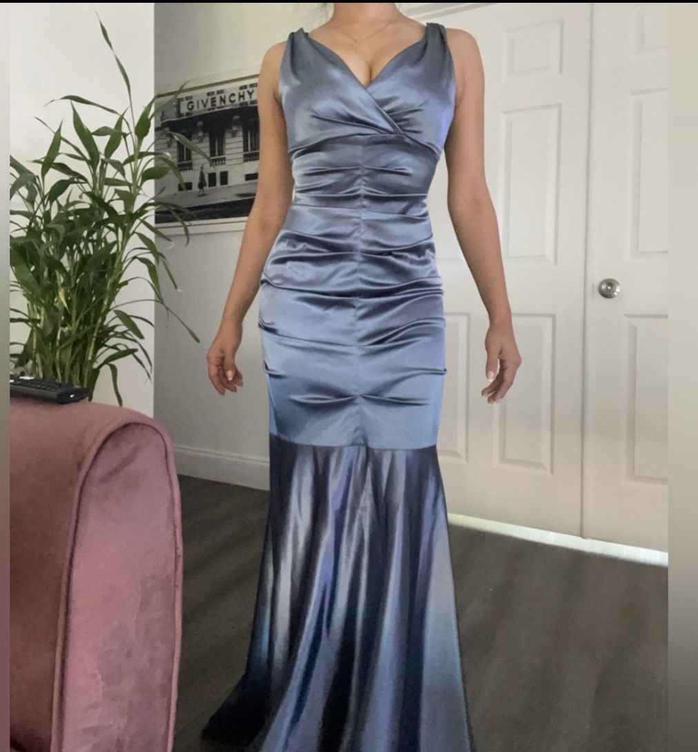 Selling a formal gown perfect for weddings or special occasions, beautiful dress with mermaid tail/ skirt finish in satin color blue-grey Size: small Pictured on 5’1 - 115 pounds