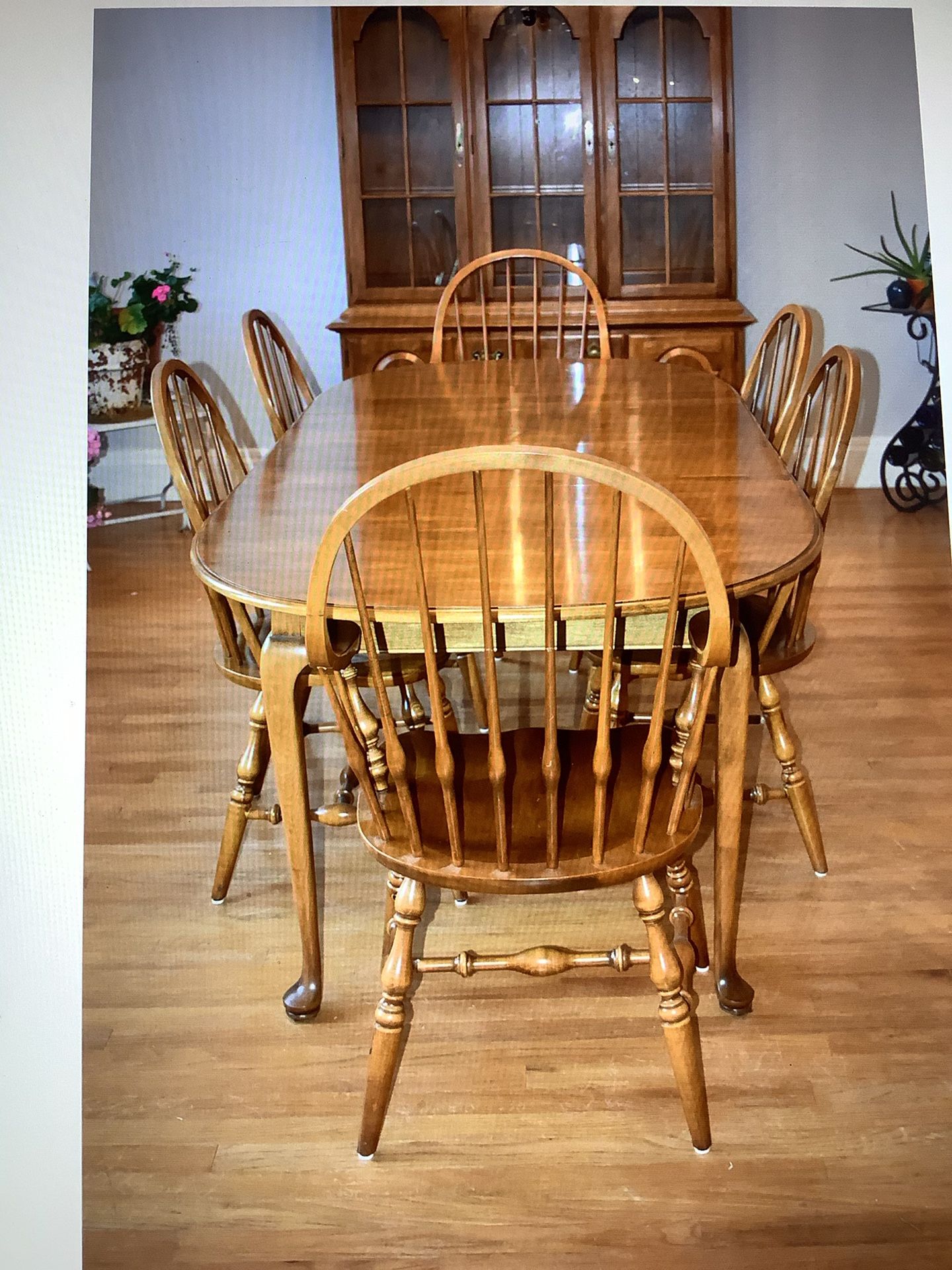 Farmhouse style in good condition. Oval table 60” with 2 15” leaves for a total of 90 inches and 6 chairs with Hutch. All sold maple wood.