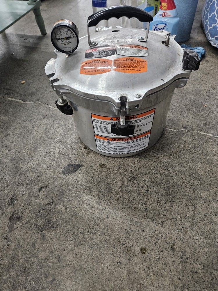 This is an All-American Model 910 pressure cooker, a stovetop canner made by the Wisconsin Aluminum Foundry Co Inc. • It has a 10.5-quart liquid capacity. • The canner features a precision-machined "metal-to-metal" sealing system that does not require a gasket. • It is constructed from heavy-cast aluminum. • Dimensions include a 12.25-inch inside diameter and a 7.75-inch inside height. • The unit is equipped with two automatic venting features for safety: a safety control valve and an overpressure plug.