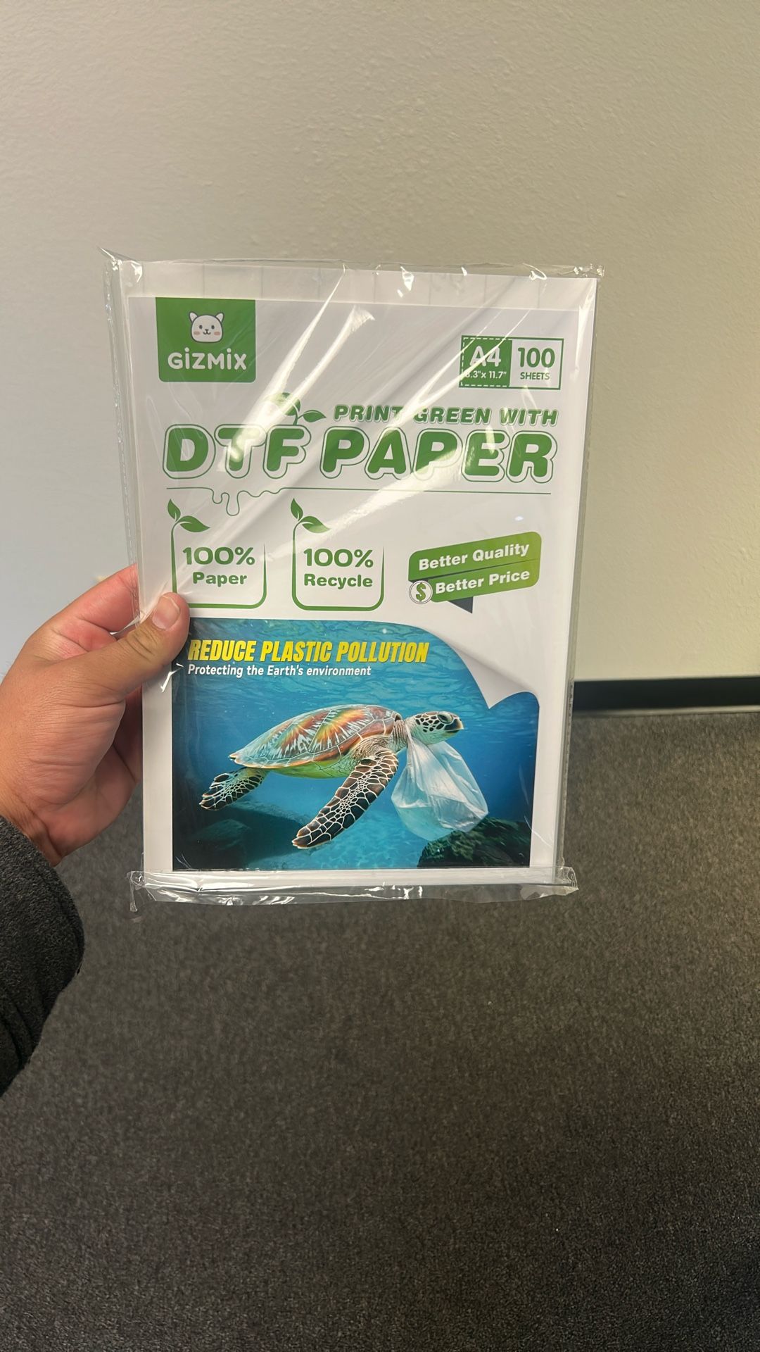 Material: 100% Recyclable Paper Color: White Sizes: A4 (8.3"×11.7"), A3 (11.7"×16.5") Transfer Type: Cool Peel Printer Compatibility: All DTF Printers (Epson-based, XP-600, L1800, i3200) Heat Press Settings: 302°F (150°C), 8–10 seconds Curing Temp: 275–284°F (135–140°C) Fabric Compatibility: Cotton, Polyester, Blends, Canvas Eco Benefit: 100% paper-based, no plastic film
