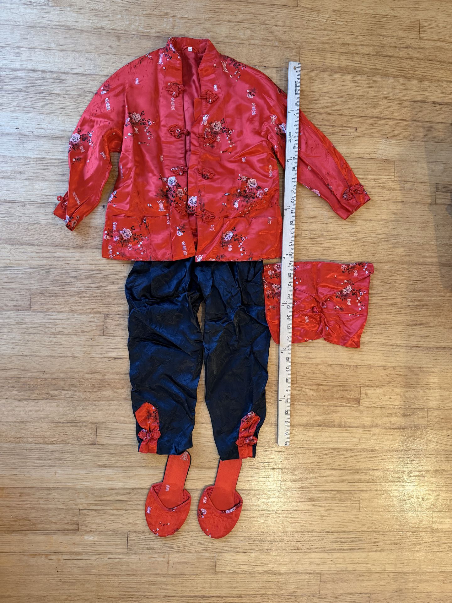Vintage Heavy Silk Chinese Silk Child’s Jacket, Pants, Slippers, and carry bag