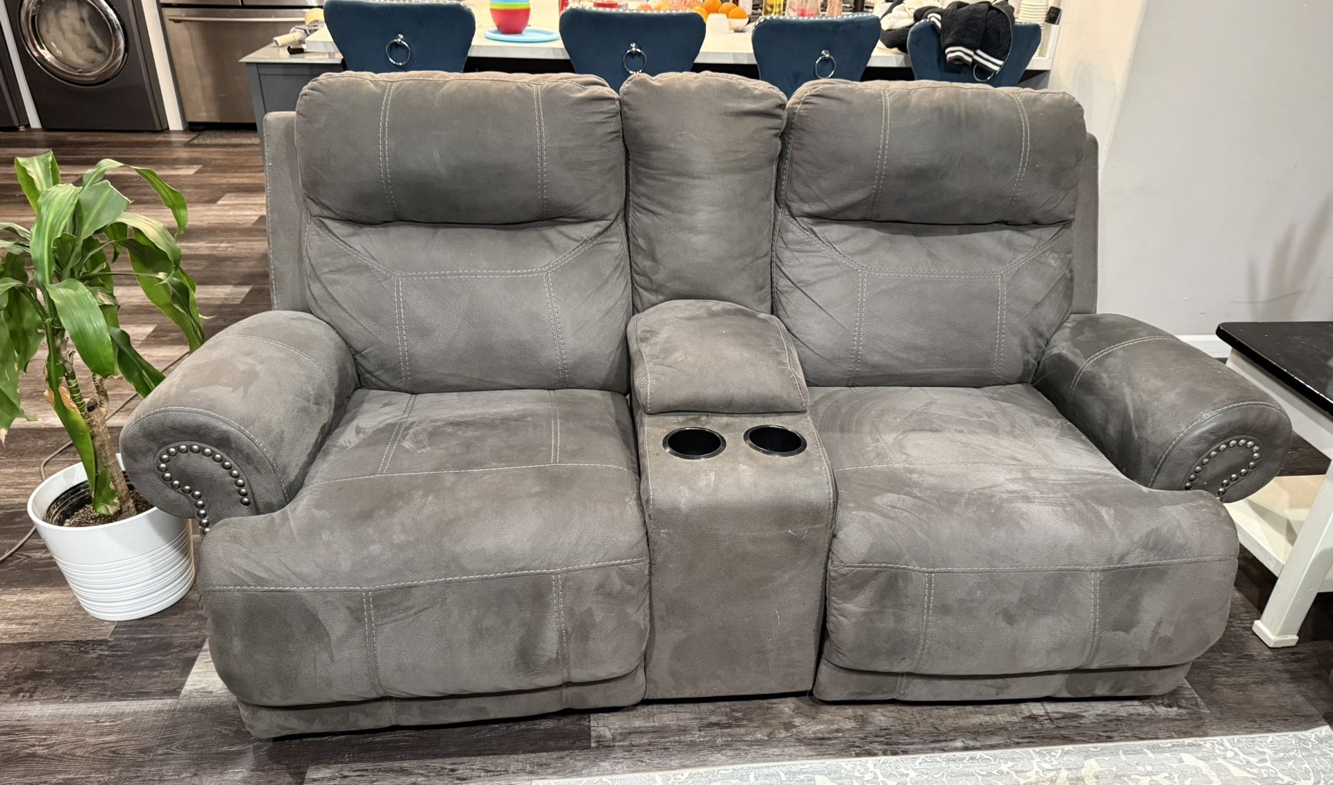 🛋️ Gray Reclining Sofa Set – Super Comfortable! Selling a comfortable gray microfiber reclining sofa set in good condition from a smoke-free home. Includes: ✔️ Oversized reclining chair ✔️ 2-seat reclining sofa (reclines almost flat like a bed) ✔️ Reclining loveseat with center console & cup holders Details: • Soft microfiber fabric • Manual recliners (all work perfectly) • Plush cushions & padded arms • Nailhead trim detail • Neutral gray – goes with any décor * some cosmetic flaws due to a few claw marks (scratches) on the back & side But structurally in good condition $600 for the full set (OBO) Will consider selling pieces separately. 📍 Pickup only 📦 Please bring help to load Largest piece is 88 inches long Love seat is 72 inches long Large chair is 52 inches long Height is @40 inches (to the top of the cushions) Message me if interested! Located in WOODLAND HILLS