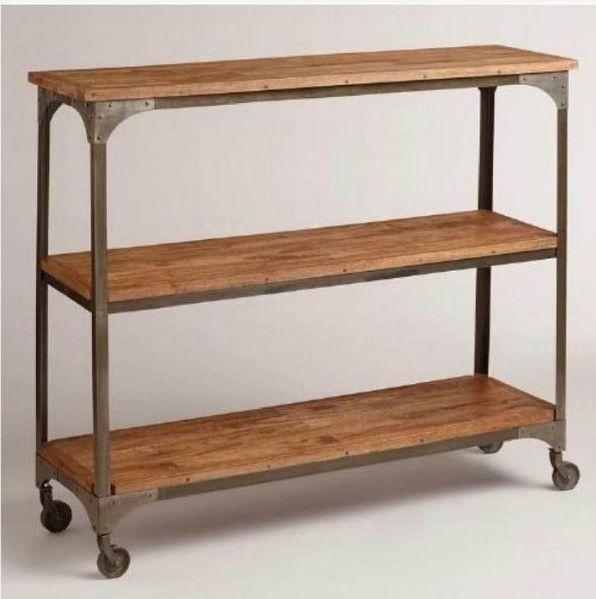 World Market Aiden Collection 3 Shelf Console. Great sturdy piece in excellent condition. Paid $350+ new. Crafted of mango wood and metal Caster industrial wheels World Market exclusive Made in Indonesia Overall: 50"W x 15.7"D x 43.3"H Floor to bottom of shelf: 7.3"H Shelves: 15.7"W x 14.5"D x 16.3"H eachk
