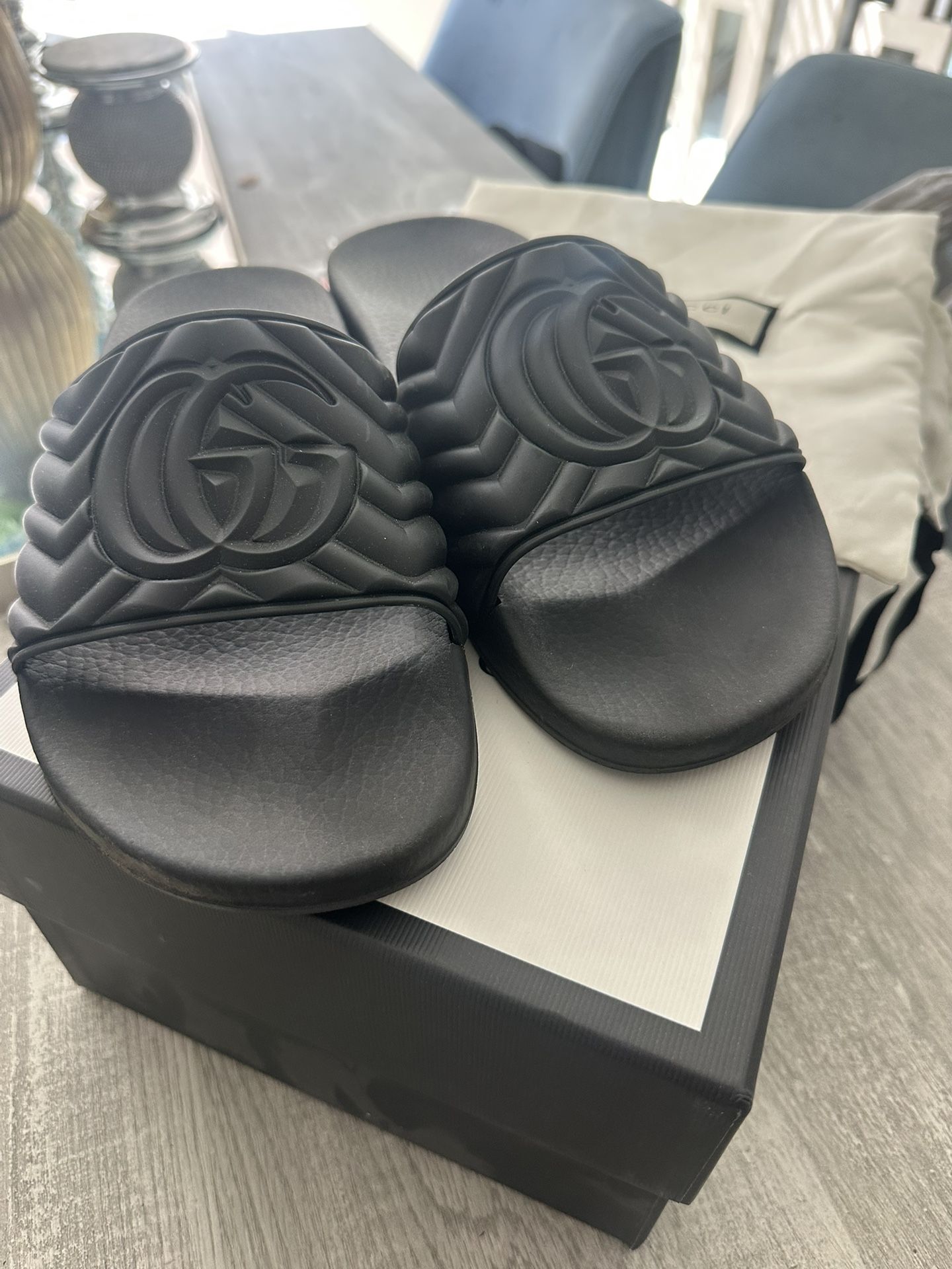Like new authentic Gucci slides with orginal box and dust bags ONLY WORN INDOORS/ in home!!! LOW BALL OFFERS WILL BE IGNORED NO TRADES!!! Size 8UK/ 9US The receipt says men’s but these were purchased in women’s department and the size aligns with a women’s 9 US