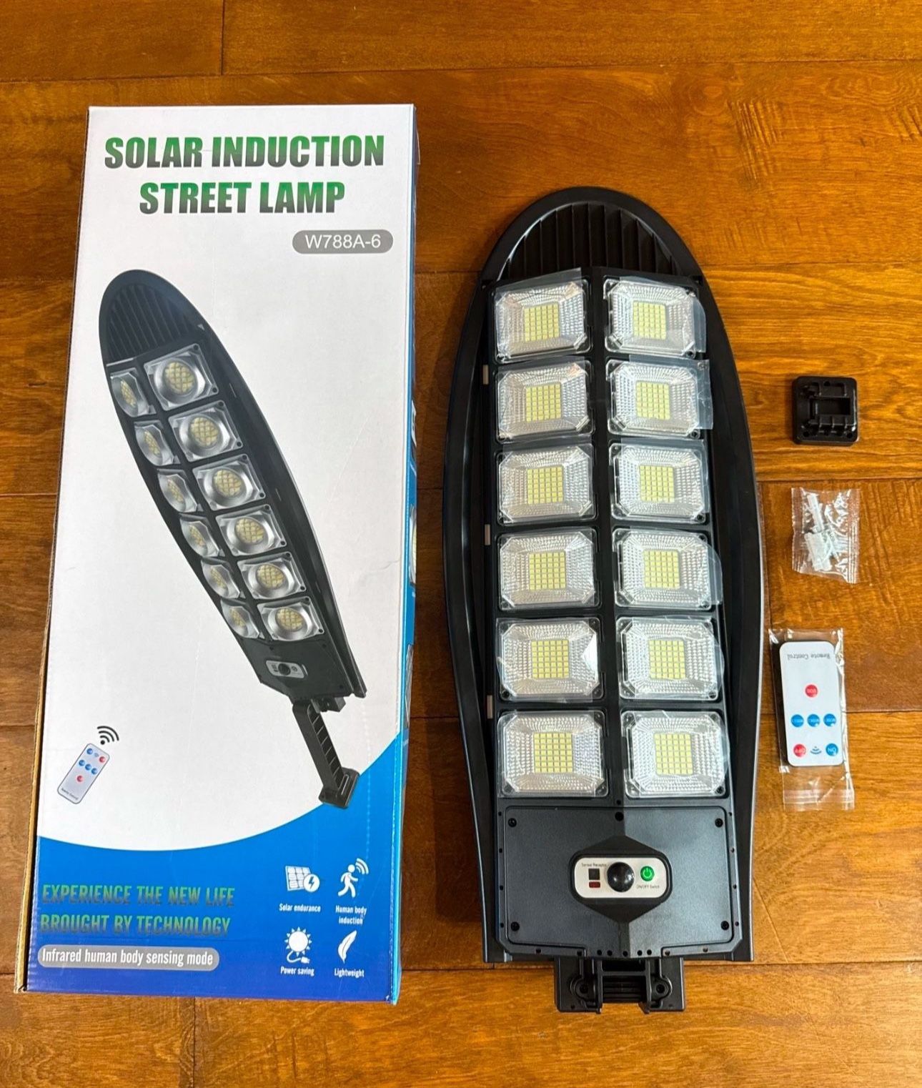Solar Motion Sensor Lights Outdoor Street Lights with Multi-Angle Adjustable / 3 Lighting Modes IP65 Waterproof Security Flood Light for Front Door Yard Garage Brand New W788A-6 Equipped with a portable remote control, there are no redundant buttons, and the minimalist design is more suitable for your use Fully sealed lamp body ABS plastic insulation material, rain-proof, snow-proof, and thunder-proof, suitable for all kinds of weather Three lighting modes: 1. The lamp is off when it is not within the sensing distance; Sense strong light when someone approaches; People to leave for 30 seconds and turn off the light automatically; 2. Weak light when no one comes, strong light when someone approaches; People leave for 30 seconds and turn off the light automatically; 3. It is always on automatically after dark There is light, there is electricity, solar charging board. Outdoor work absorbs sunlight for charging, environmental protection, and energy saving Suitable for outdoor lighting, and can be widely used in courtyard lights, garage lights, garden lights, parking lot lights, exit lights, entrance lights, driveway lights, courtyard lights, entrance lights, etc.