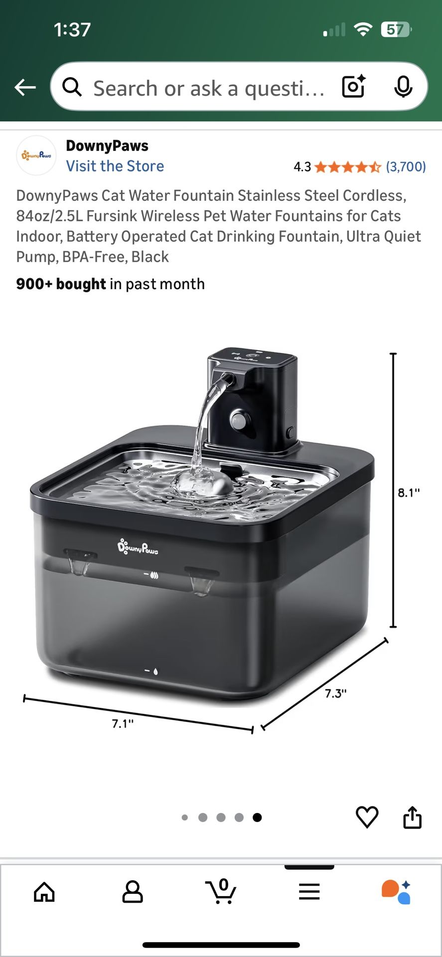 Stainless steel bowl, cordless, rechargeable battery, 84oz/2.5L, for indoor cats, ultra quiet pump, only 30dB, BPA-Free, black, 7.1”w x 7.3”l, x 8.1”h Comes with set of 2 extra filters