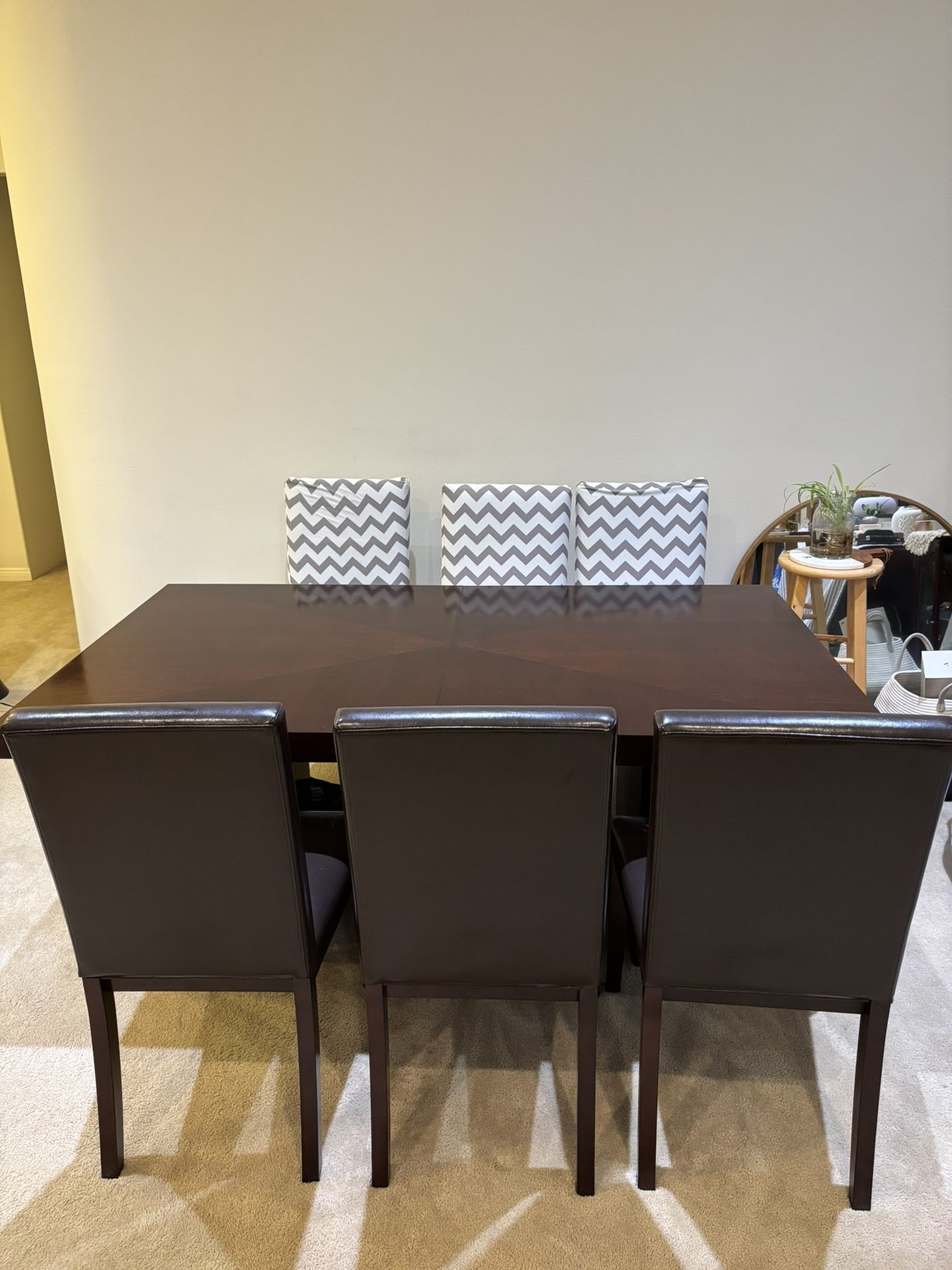 Brown Rectangle Dinning table 72”W x 42”D x 30”H 6 chairs included (can include seat cover) Require pick up in Irvine.