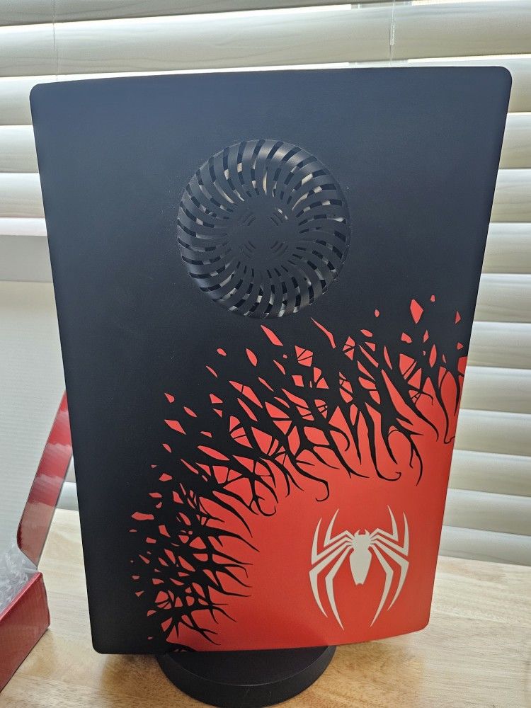 Adult owned PS5 Digital edition aka disk-less model 825 GB comes with standard power and HDMI cable and controller. Have red controller pictured above. Has grips and thumbstick grips. No Trades Includes: -spiderman 2 controller with box. Barely used. -spiderman plates with fan cutouts. Please see picture. These I got custom. Not the original SONY plates. - original plates. White color. Will be included and in the box like the picture. - dual charging dock with power cable - 1TB samsung SSD already installed. So you have 1.825 TB of storage. Almost 2 TB of storage. Box included too. I have box for PS5 but outer box is kinda torn but other packaging stuff is there if you want. Let me know if you have questions. If you want more pictures just ask.