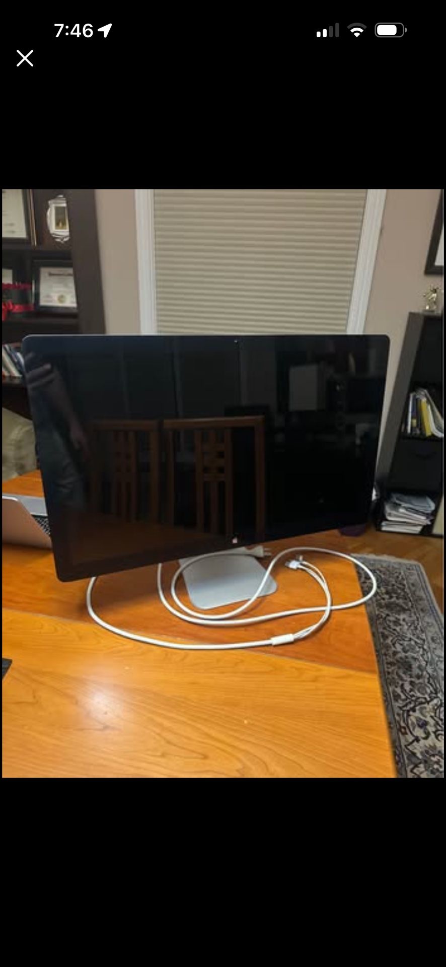 Selling my Apple Thunderbolt Display (27-inch). Physically in great condition with no cracks in the glass. When connected to my MacBook, the laptop recognizes the monitor (it shows up in settings) but the screen remains black. Specs: Resolution: 2569 x 1440 Ports: 3x USB 2.0, 1x FireWire 800, 1x Gigabit Ethernet, 1x Thunderbolt Includes built-in MagSafe charger for older MacBooks. Selling as-is