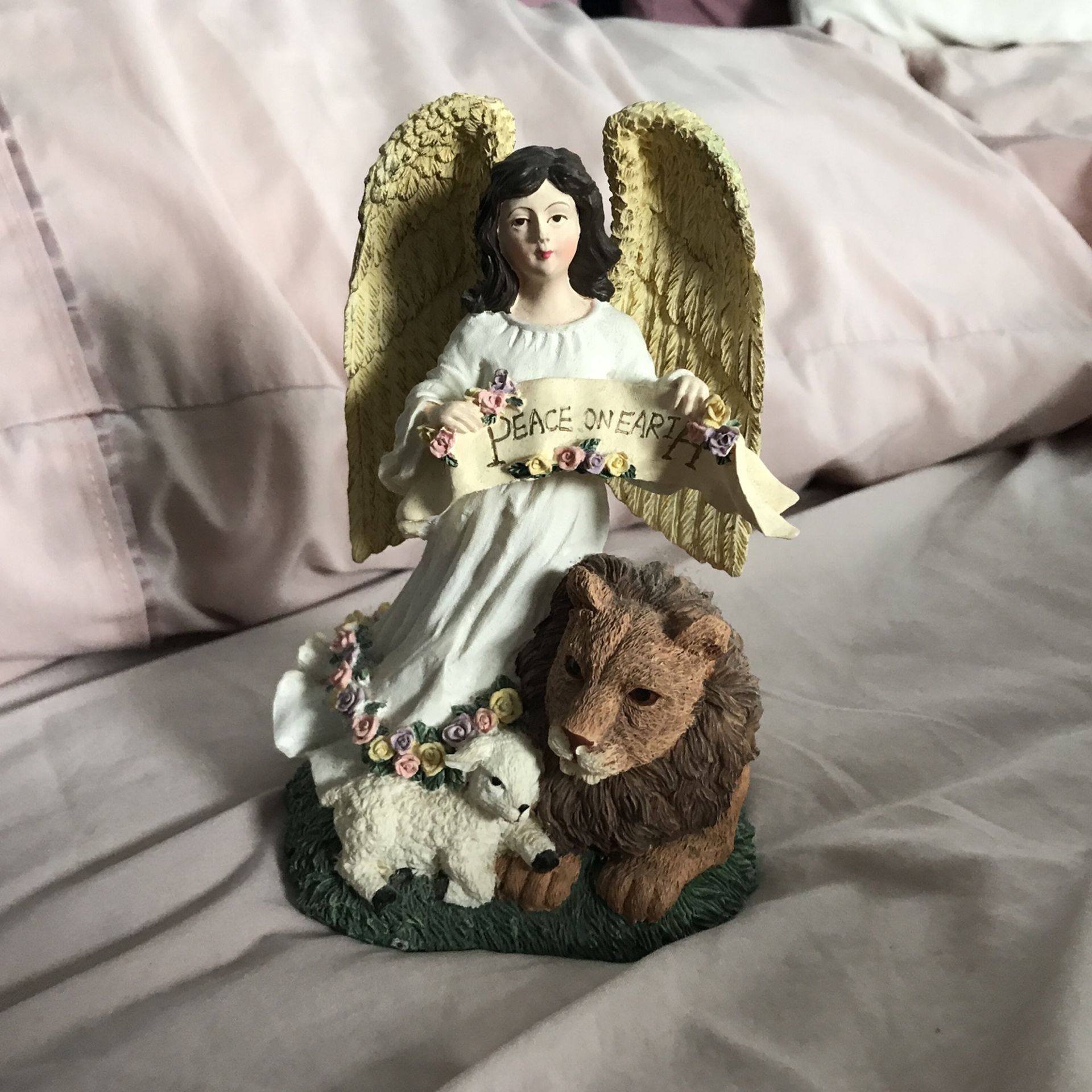 Angel and lion and lamb, together, wind up music box plays Joy to the world