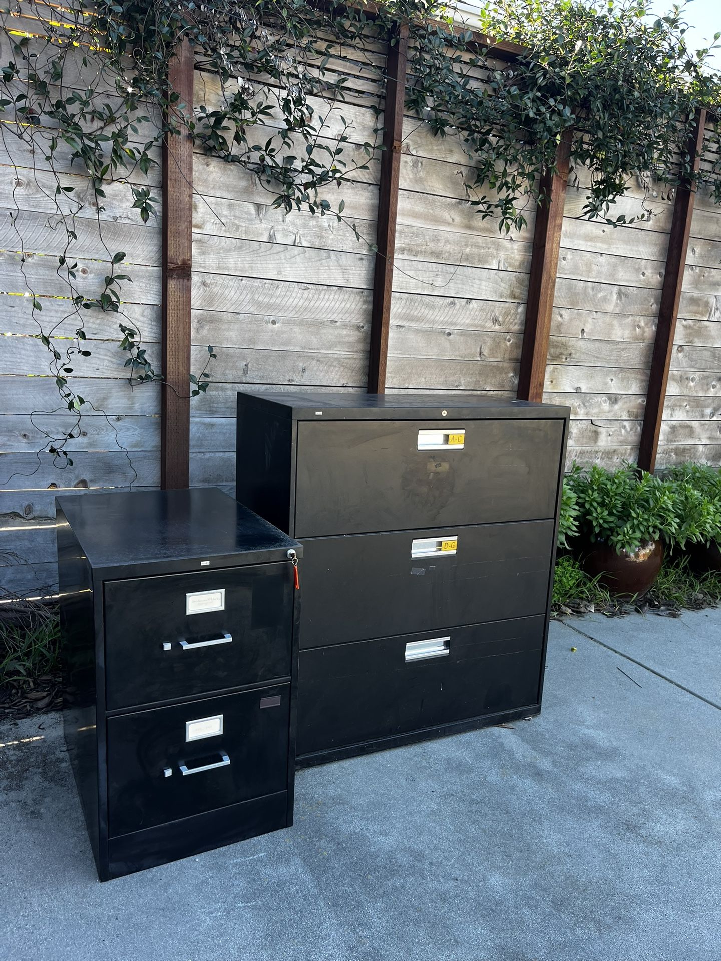2 Black Metal Filing Cabinets One With Key Small filing cabinet comes with key Large one does not Good overall condition Large : 19.25” depth 40.75” height 36” width Small: 18” width 29” height 26.5” depth Easy pick up in Del Rey 90066
