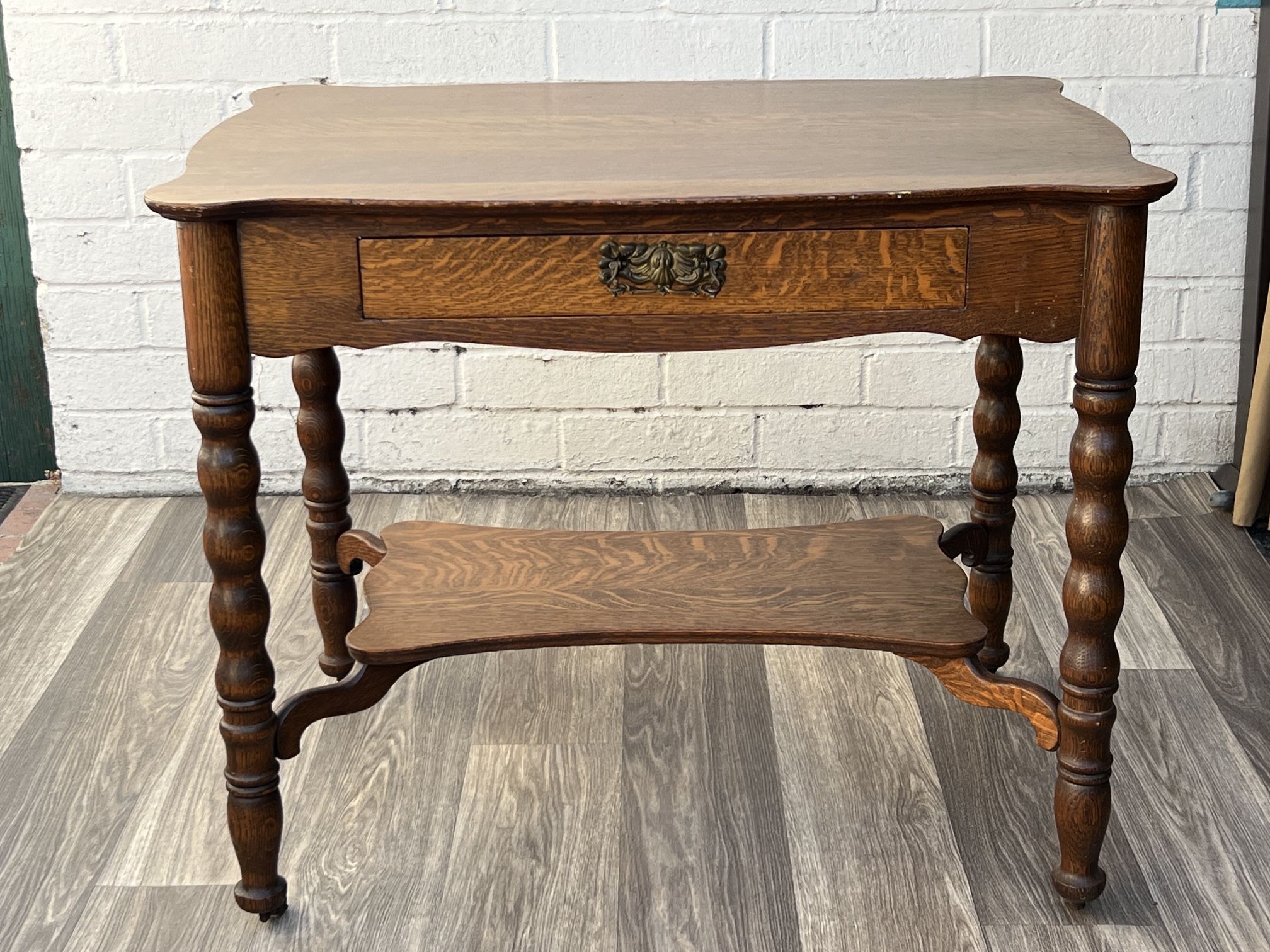 Antique Tiger Oak Writing Desk, One Drawer, One Lower Shelf, Original Casters