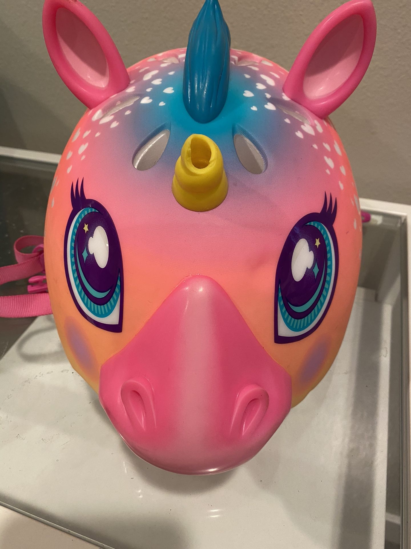 Girls unicorn size small (50-54cm) helmet. Would fit about age 3-7 years old. My daughter outgrown it at age 7. Great for biking, roller skating, roller blading, scooter, or skateboarding. Comes from smoke free / pet free home
