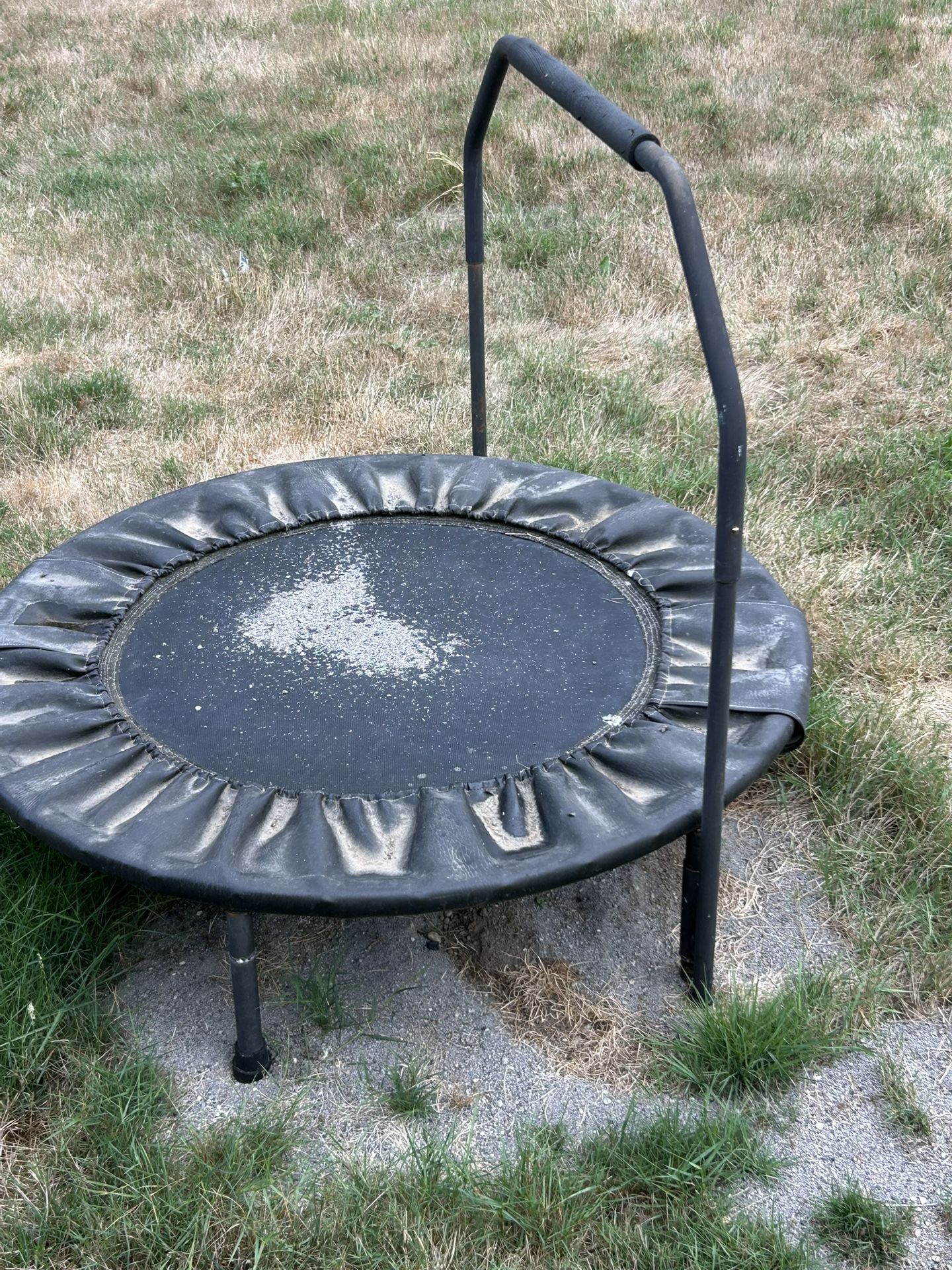 Selling a 40-inch black trampoline with sturdy iron handlebar. Suitable for both kids and adults, great for exercise, fun, and indoor/outdoor use. Strong frame and safe design, easy to move and store. Good condition, ready to use. Price: $20. Pickup only.