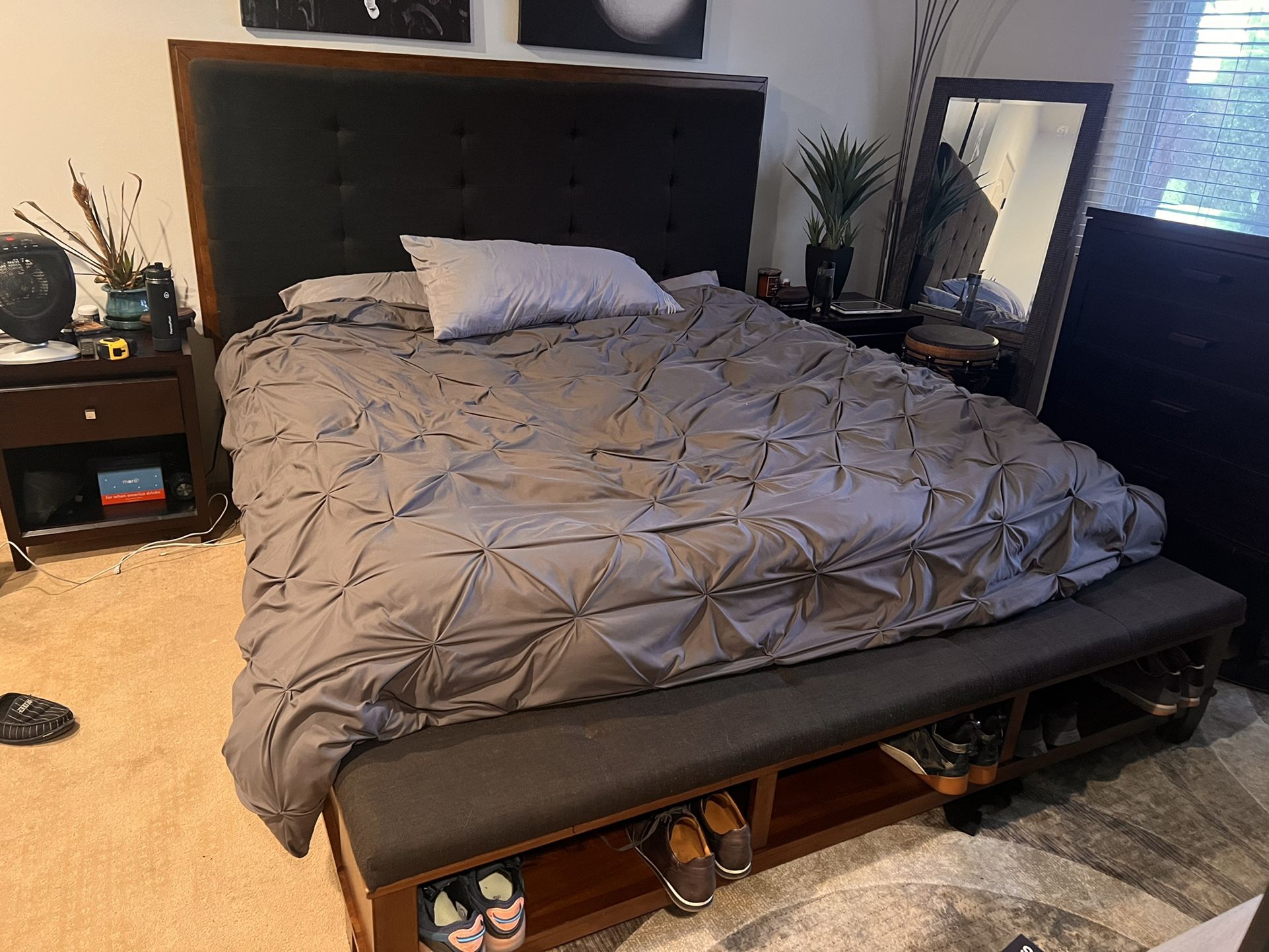 Eastern king bed frame for sale. Great condition. Very sturdy! Shoe holder at the end. Mattress is an extra $1200 if you want it. Two month old Casper mattress purchased from Costco.