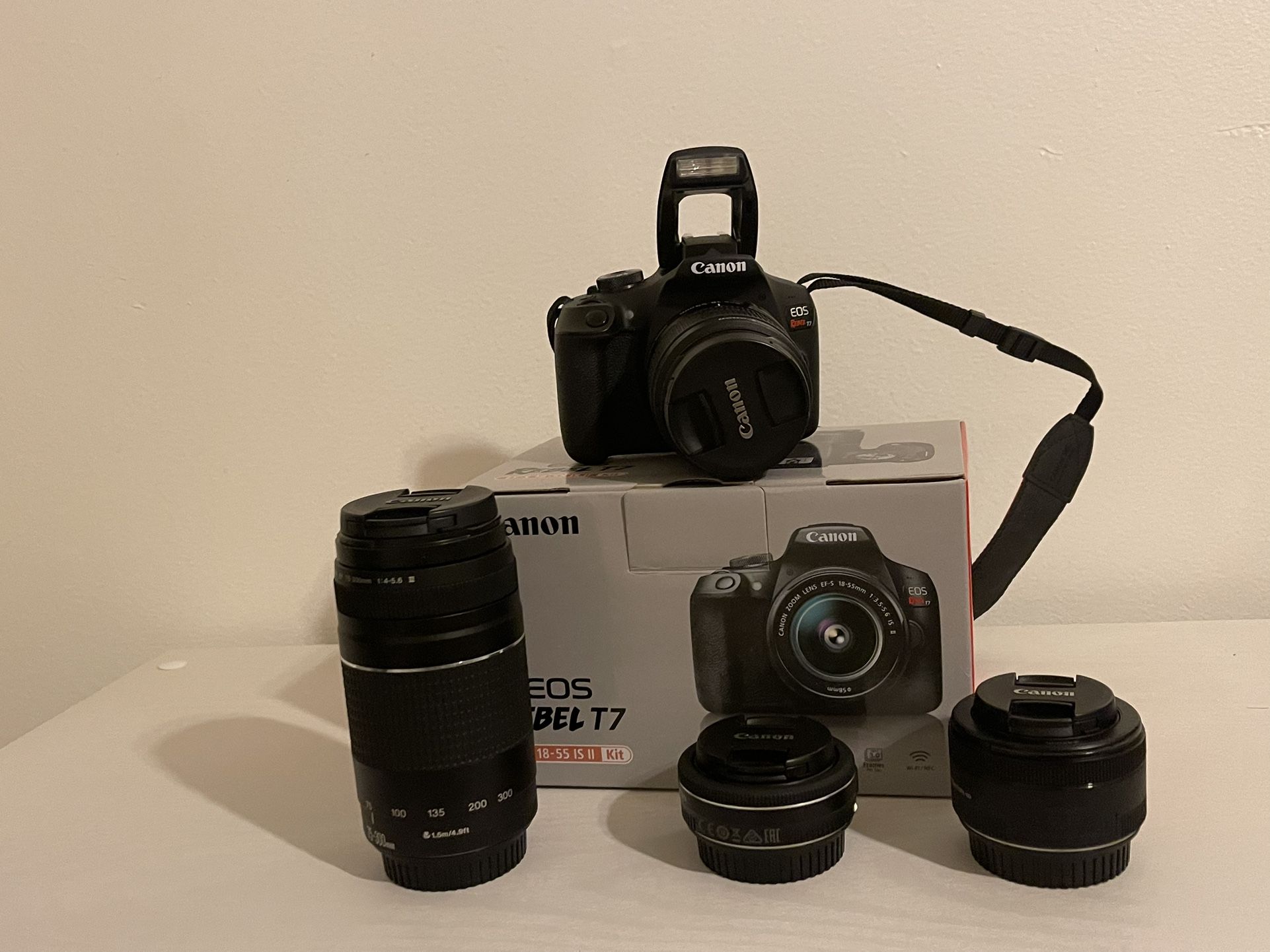 Selling a canon t7 in great condition with 4 lenses 18-55mm Lens 50mm lens 24mm lens 75-300mm lens Battery and bag
